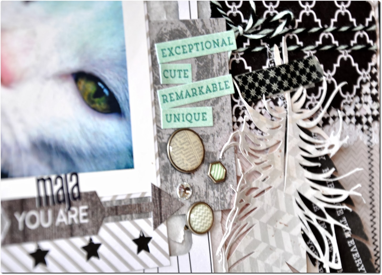 Hier mein Sonntags-layout mit Sketch Nummer 19. Diesmal musste meine Katze dran glauben. Sie ist total kuschelig aber manchmal auch sehr speziell! Das Papier stammt hauptsächlich von Project Life, „Midnight edition“. Die Federn sind mit dem Silhouette Cameo ausgeschnitten.