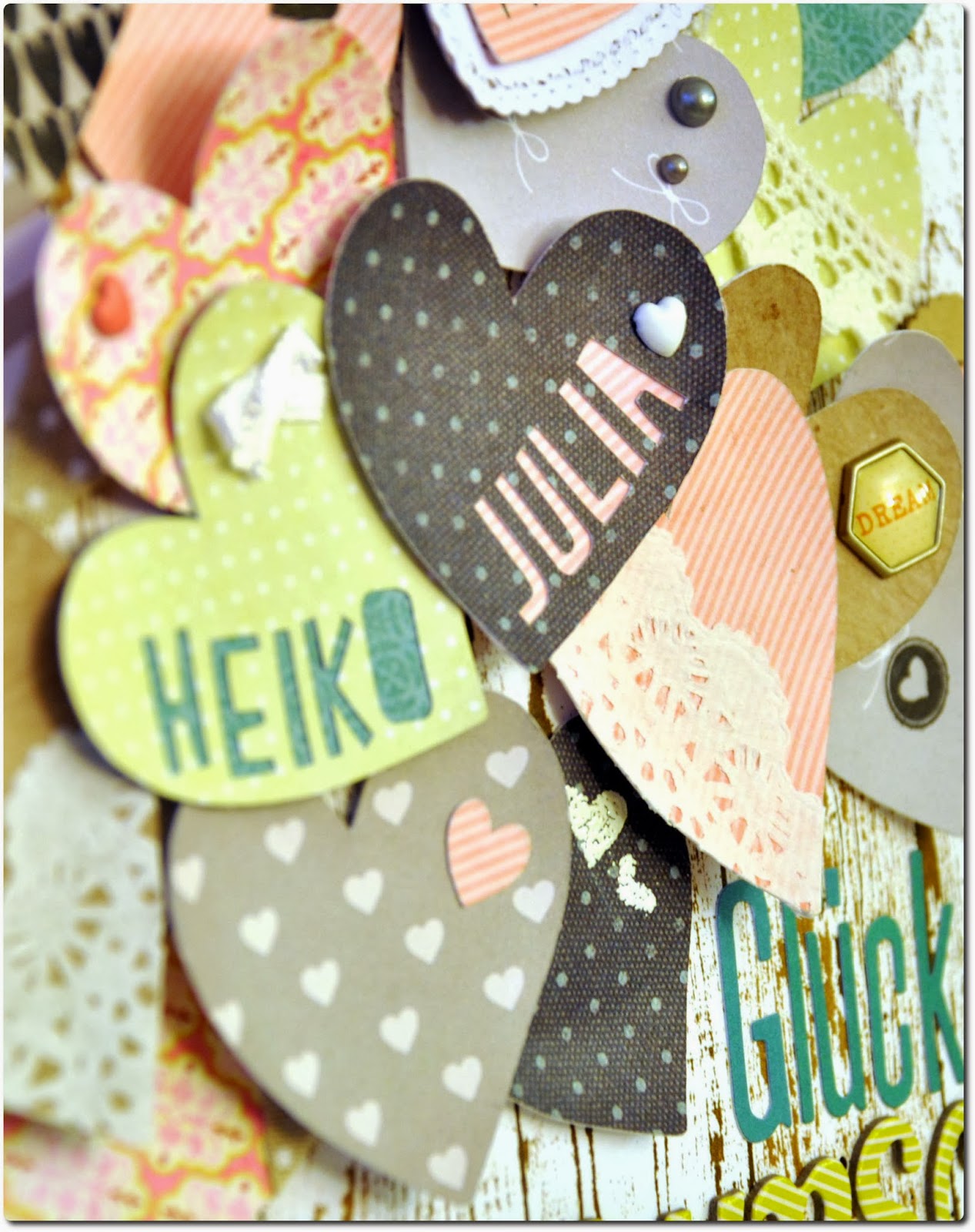 | Main paper is from Webster’s pages „family traditions“. Hearts are cut out with my silhouette. |
