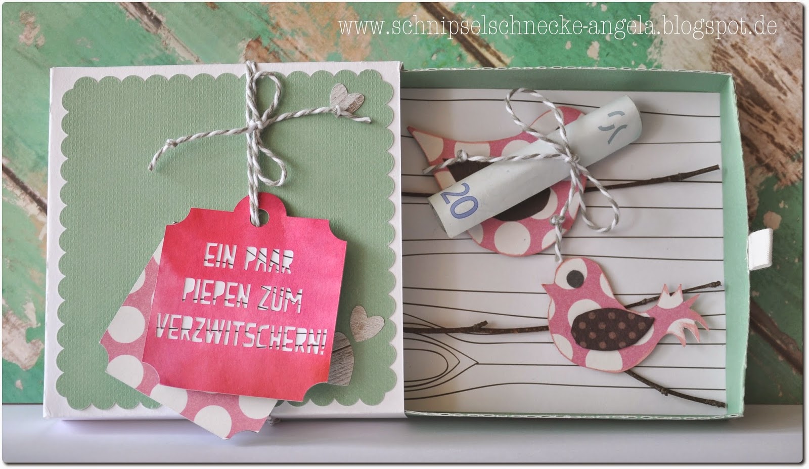 Und hier das passende Geschenk dazu, natürlich Money. Die meisten haben ja doch schon alles. Die kleine Box lässt sich zur Seite aufziehen und zum Vorschein kommen die „Piepen“ zum „verzwitschern“.