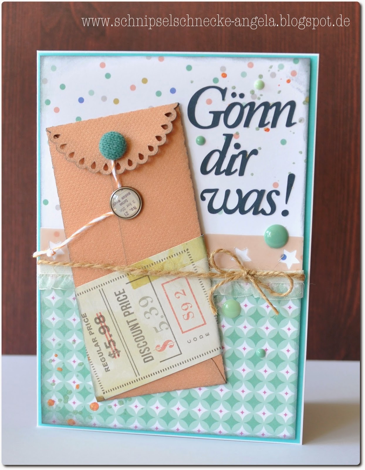 This card can be used for vouchers or for hiding money in this little pocket. „Gönn dir was“ means something like buy something for yourself or do something good for you! Backgroundpaper is from the 6×6 Mixed company collection from heidi Swap.