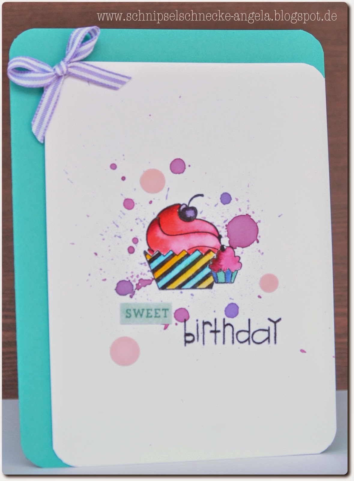 Heute gibt’s was Süßes. Die beiden Cupcakes sind in Masking Technik übereinander gestempelt und mit Wasserfarben koloriert. Der birthday Stempel ist von Papersmooches (Sentiment sampler).