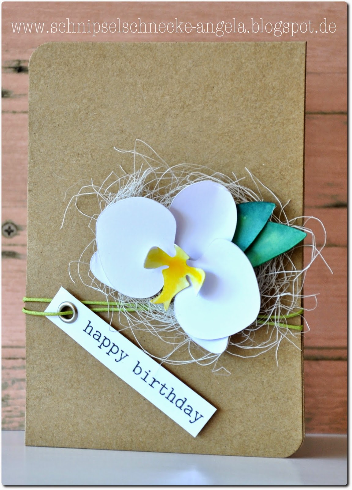 Thema der tollen CASual Challenge ist Kraftpapier, Blumen und Fäden. Also genau mein Thema. Seid langem wollte ich mal meine Orchideen ausprobieren die ich in meiner Silhouette Sammlung habe. Und zack fertig ist die Karte. Die Orchidee ist einfach aus weißem Papier ausgeschnitten und dann mit Wasserfarben koloriert. Der Happy Birthday Stempel ist von Winni&Walter. Schön clean und simple.