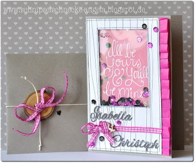 Now it’s time to show the wedding card. This time with a shaker window as a polaroid photo. Of course I used pink sequins as shaker elements and pearls in a coordinated color. Both names are cut out with my silhouette and glued together in layers to create a 3D effect. The envelope is decorated with a wood button which was also handmade.