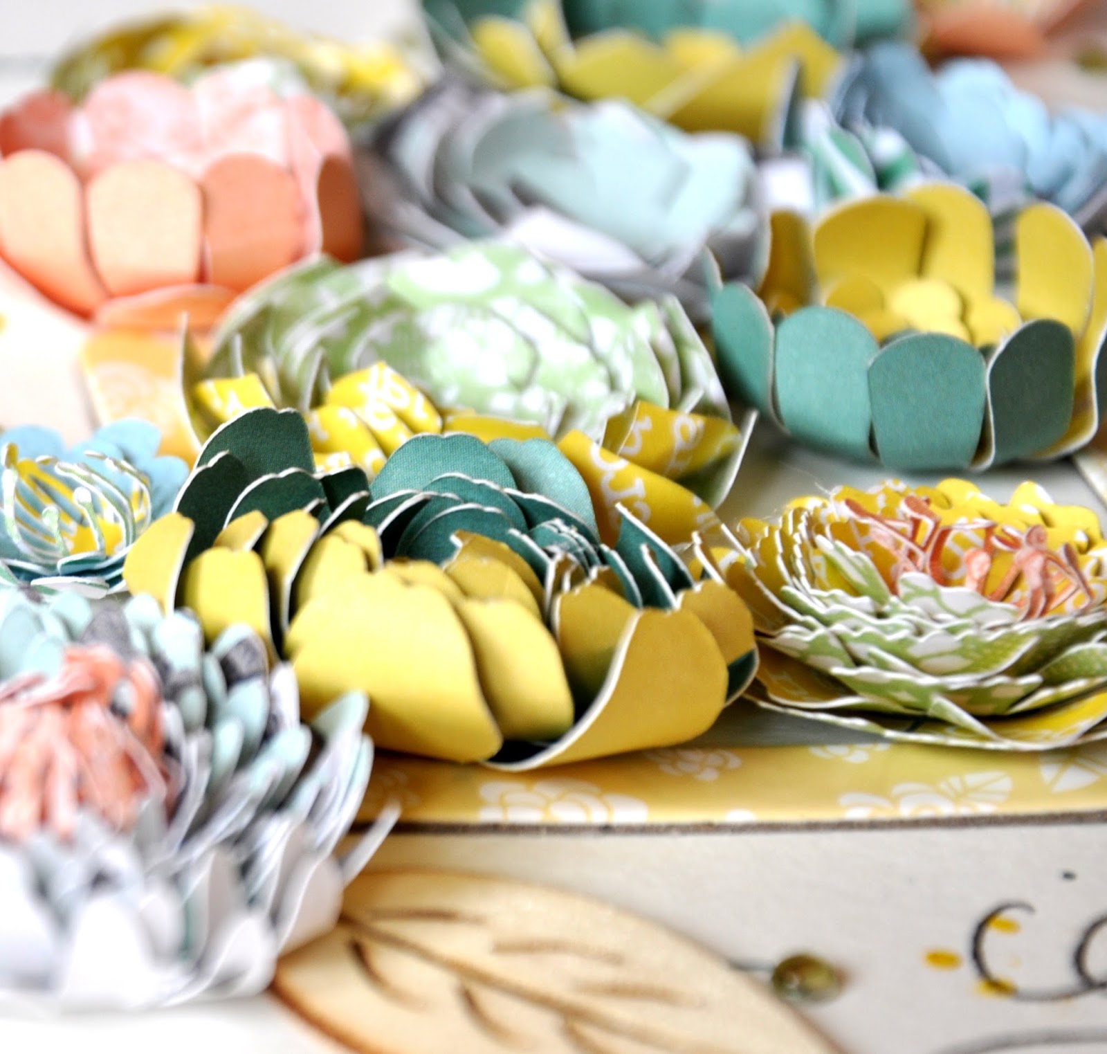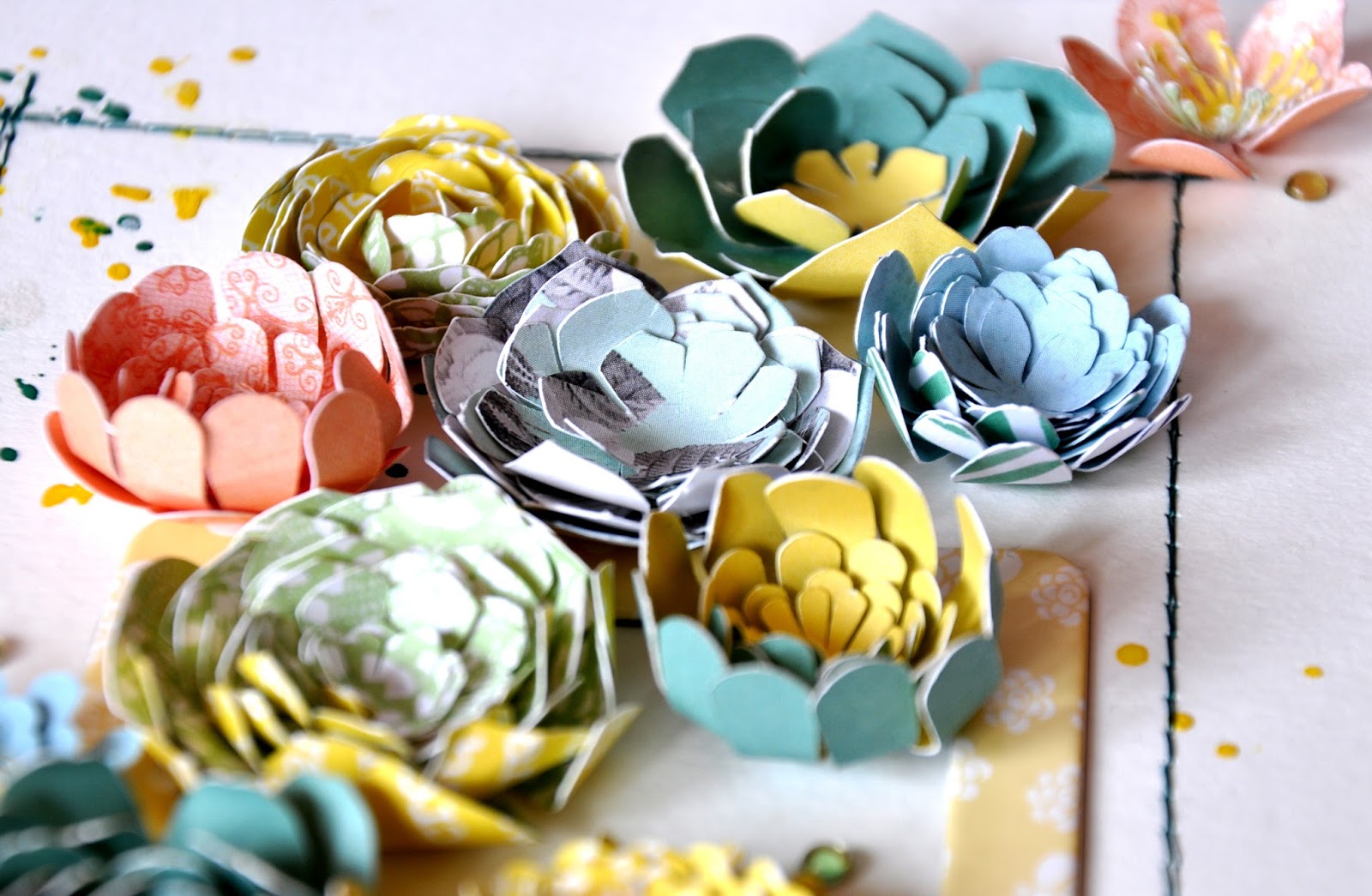 Aus vielen verschiedenen Papieren (z.B. von hier) habe ich mit meiner Silhouette ein paar Blütenblätter ausgeschnitten und zusammengesetzt. Wenn das nicht immer so aufwendig wäre würde ich ständig Blümchen machen. 😉