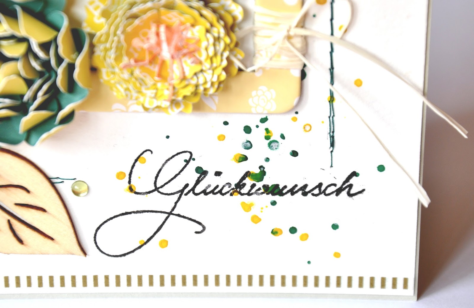 Der Hintergrund ist dagegen sehr schlicht, etwas Farbspritzerei und ein netter Rahmen (aus dem April Kit 2016 „Na aber hallo“) und schon ist die Karte fertig. Voilà!