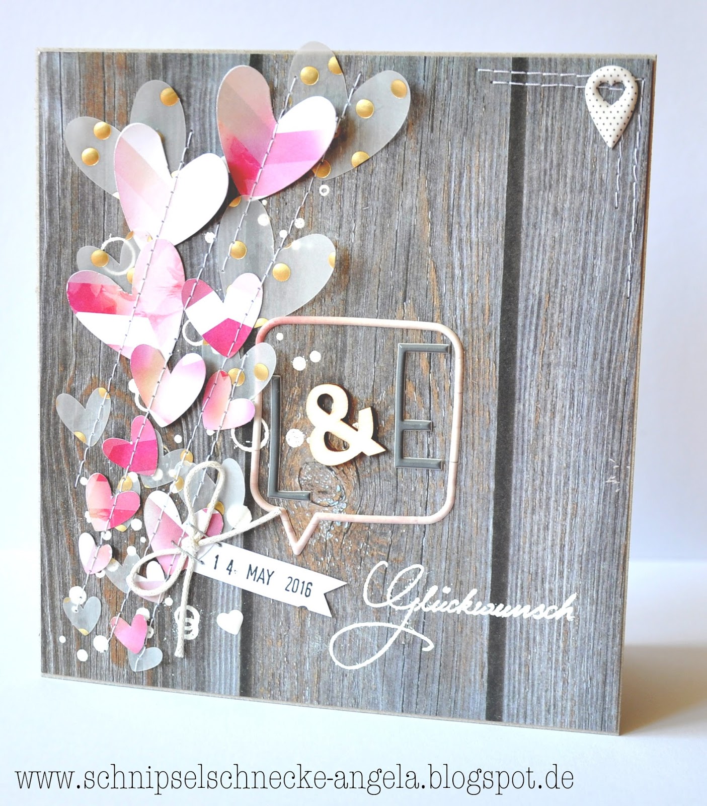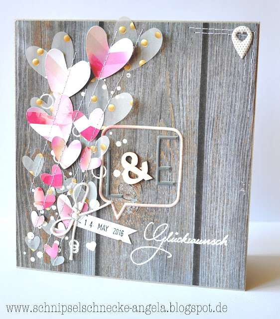 Man jetzt ist es fast schon einen Monat her seitdem ich zuletzt was gezeigt habe. Schande, schande! Aber jetzt nun dch mal wieder eine Hochzeitskarte mit gaaanz viel Herzen. Das Transparentpapier mit den goldenen Punkten ist von Studio Calico (Gold Punchinella). Momentan stehe ich ja total auf die Puffy Stickers. Die Sticker die ich verwendet habe stammen aus der „c’est la vie“ Kollektion von Pink Paislee.