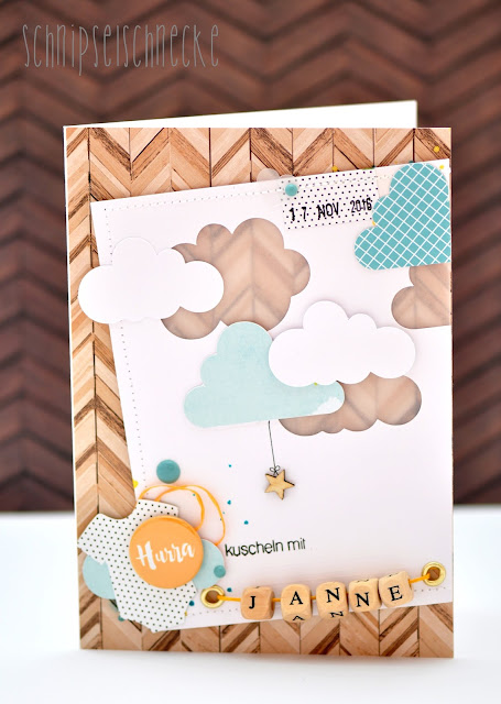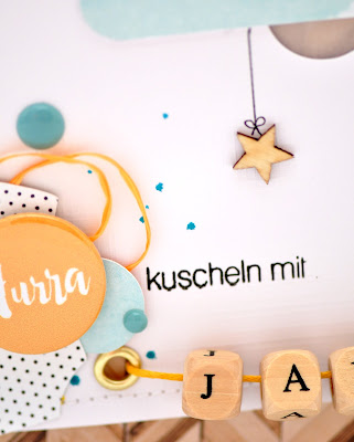 Zwischen den Weihnachtskarten wird sich heute wohl doch noch eine Babykarte dazwischen mogeln. Diesmal mit der Idee den Namen als Buchstaben Kette zu machen. Letztens habe ich eine Riesenpackung dieser Würfelchen ganz günstig erstanden und da hätte der Name auch ruhig ein wenig länger ausfallen dürfen. Aber der Kleine Janne heißt nun mal Janne. 🙂
