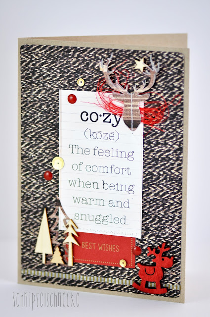 Hier hab ich gleich zwei Karten für euch. Das Papier ist zum Teil noch aus dem November Kit von Danipeuss. Und diese kleinen süßen Holz-Schaukelrentiere sind aus dem Drogerie Markt. Was man da so allerlei finden kann! 🙂