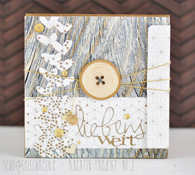 Der Holzknopf ist bei meinem Vater entstanden, genauso so ein Bastler wie ich. 🙂 Den Schriftzug habe ich mit meiner Silhouette gemacht. Bin leider immer noch eine von den Wenigen die keine Stanzmaschine besitzt.