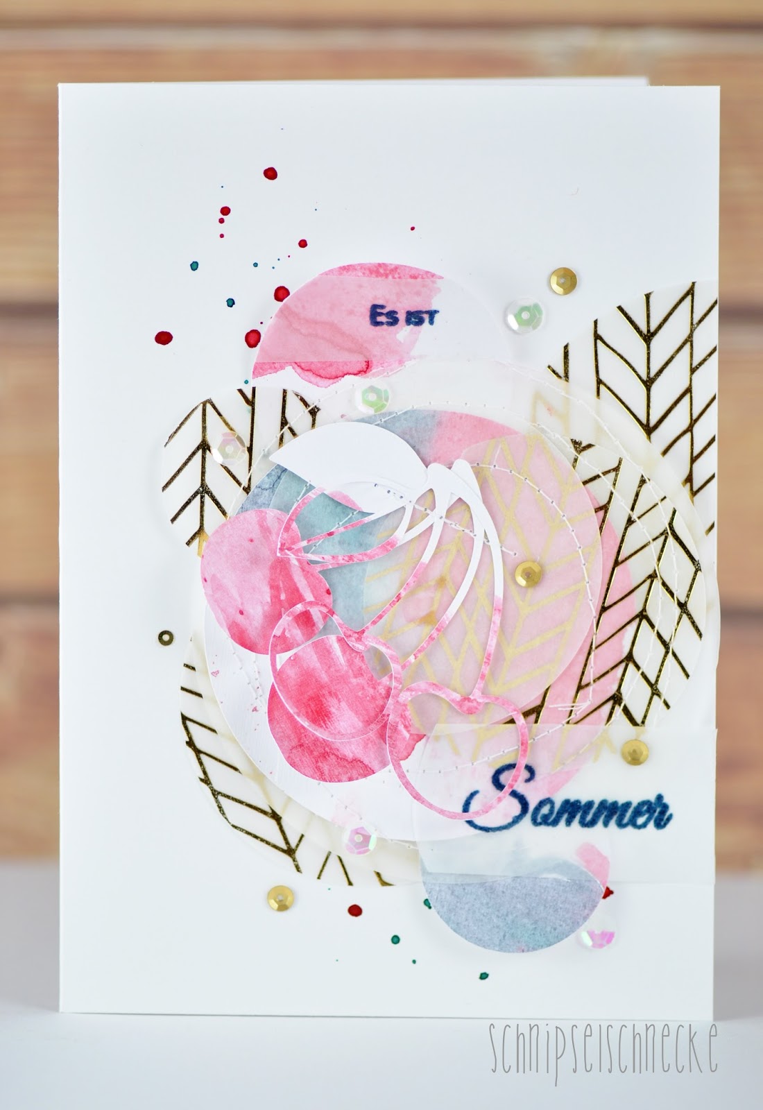 …bei der Sommerchallenge von Papierelle. Die liebe Conny hat mich auf die Idee gebracht. Sie hat mit ihrer wunderbaren Erdbeerkarte auch mitgemacht. Die Challenge geht noch bis zum 13.08. also musste ich mich sputen. Ich hab mich für Kirschen entschieden. Schön mit Aquarell koloriert und dann mit ein paar Layern aus transparenten und Aquarell-Kreisen vereint. Der Schriftzug ist quasi Programm – „Es ist Sommer“ in blau embossed.