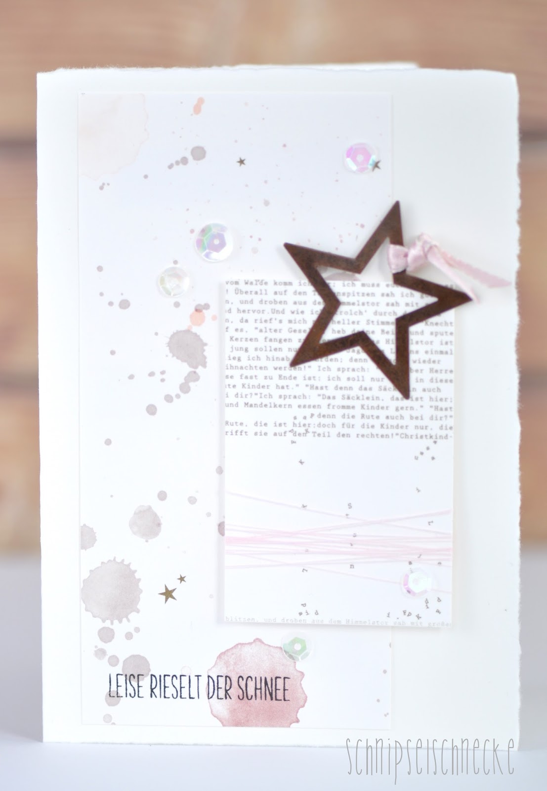 Heute zeig ich euch mal die Erste Weihnachtskarte. Und da es am Wochendne doch schon weiße Flocken geschneit hat, passt der Titel ja wunderbar. Bei den Papieren von Alexandra Renke braucht es meist nicht sehr viel mehr, ein bisschen rosa Garn ein paar Pailetten und ein Metallstern aus meinem Fundus. So klappt das auch mit den Weihnachtskarten rechtzeitig vor Weihnachten.