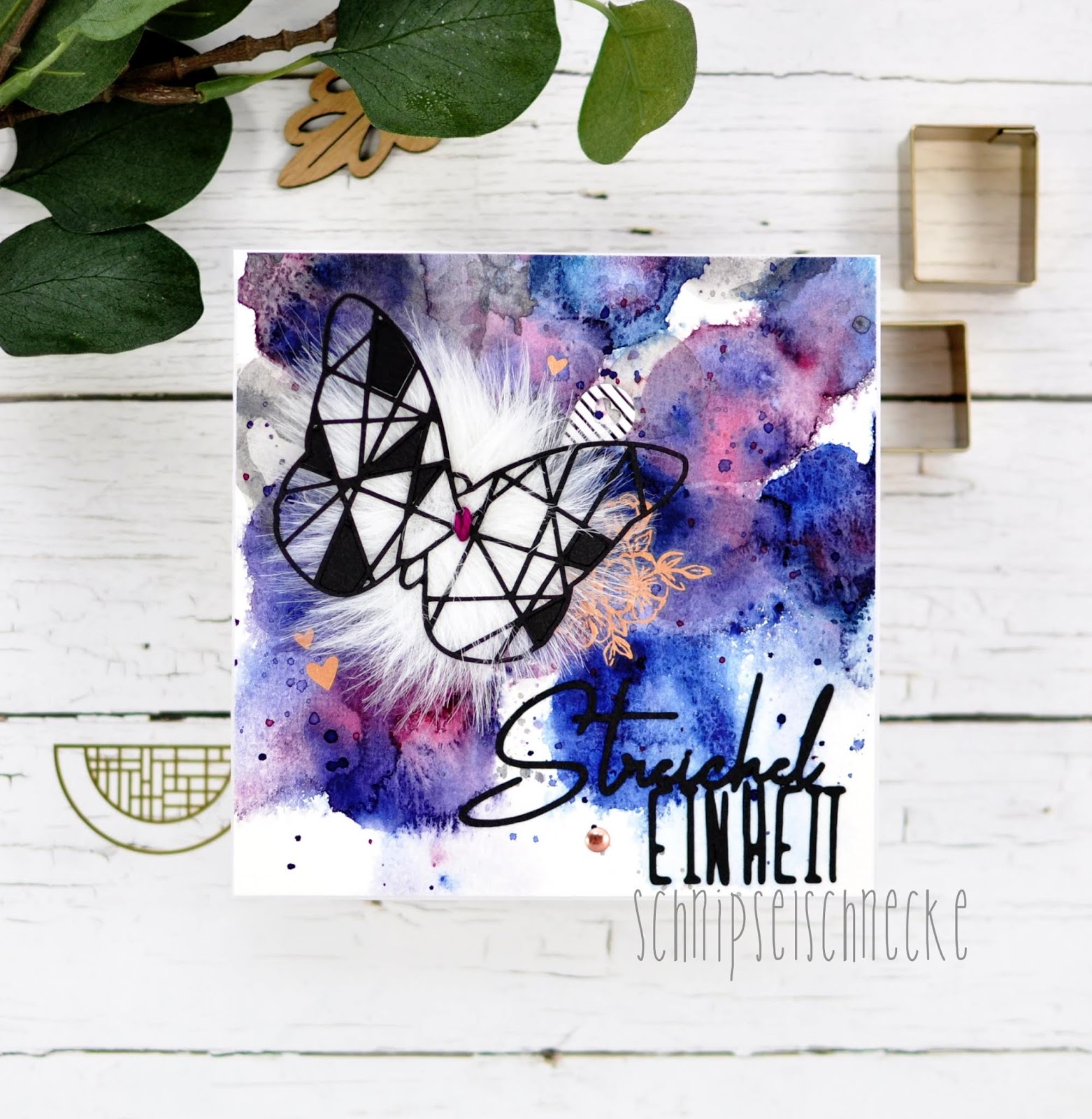 Nicht mehr lange hin zum Valentinstag, also nichts wie ran an die herzigen, liebevollen Kärtchen und Layouts. Den Anfang macht heute ein geomerischer Schmetterling auf dem noch winterlichen Fellimitat. Mit Aquarell gekleckst habe ich auch schon wieder, das leuchtet immer so toll.