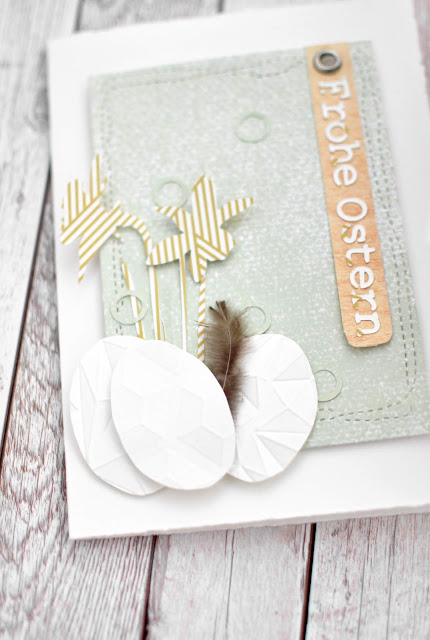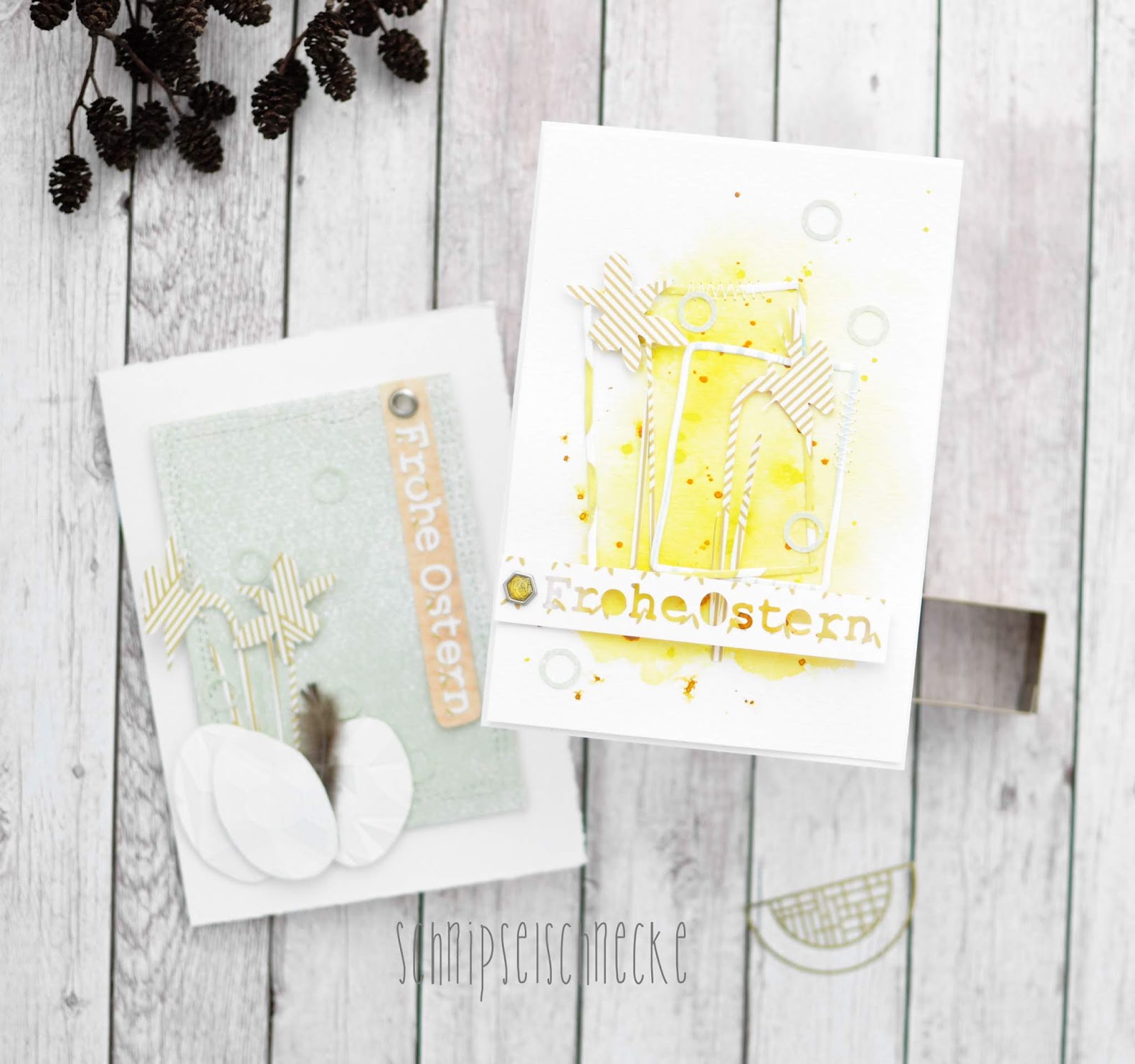 Ganz dem Motto, habe ich heute was Österliches für euch. Einmal in gelb aquarelliert und verziert mit Narzissen und einmal mit geprägten Ostereiern. Die schönen Papiere sind von Béa, ihr findet sie hier.