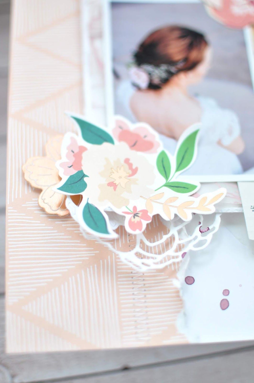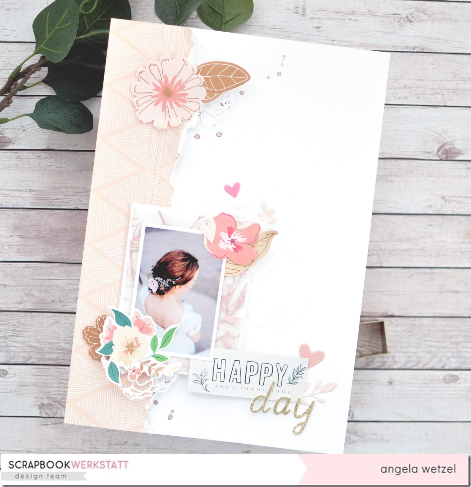 Ok, das könnte ich von hinten sein, aber es ist tatsächlich meine Zwillingsschwester an ihrem schönsten Tag. So ein schönes Fotos musste verscrappt werden mit dem wunderbar floralem Mai-Kit der Scrapbook-Werkstatt, was ihr ab dem 20. April bekommen könnt. Das Kit ist ein Traum und ich freue mich schon sehr euch meine Werke zu zeigen.