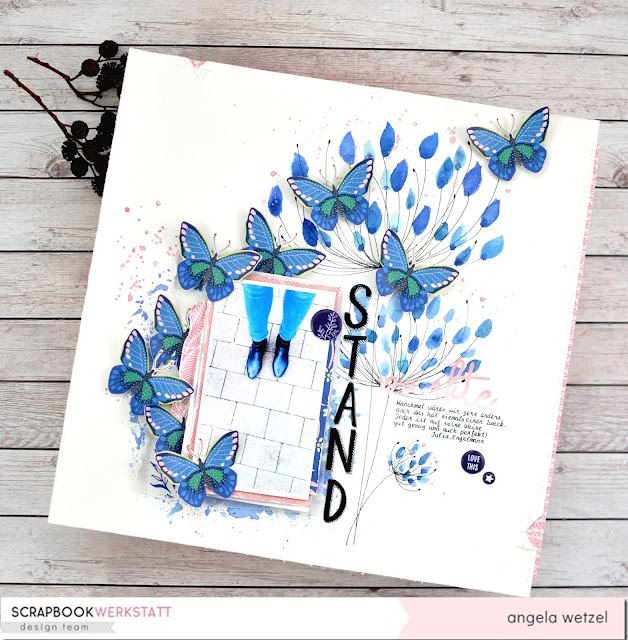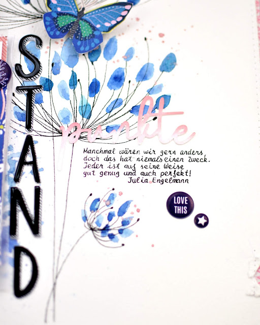 Den Hintergrund mit den Blumen habe ich ganz einfach mit Aquarellfarben und einem Fineliner gemacht. Ein paar Kleckse und ein bißchen Papier-gelayert …. und fertig ist mein Layout. Diesmal mit einem wunderschönen Spruch von Julia Engelmann…. kennt ihr nicht. Solltet ihr kennen. 😉