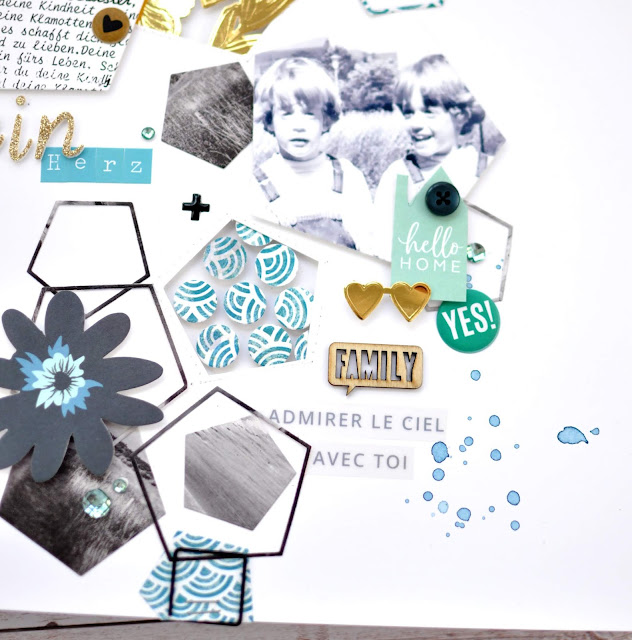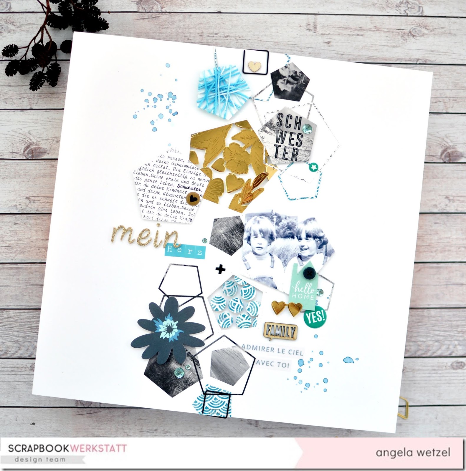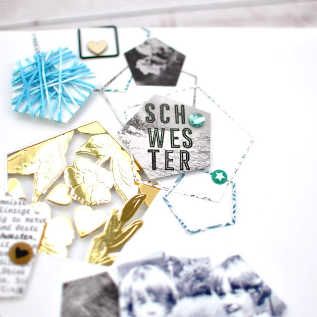 Die Hexagons sind mit mit der Silhouette ausgeschnitten oder auch mit der Big Shot. Bis jetzt gibts es ja leider keine Big Shot die auch 30×30 Papiere schneidet. Die in gold embossden Die-Cuts habe ich mit Foam Tape hinterlegt, dass sie richtig Tiefe bekommen, das Gleiche habe ich auch bei den Punkten gemacht. Es hat richtig Spaß gemacht rum-zu-experimentieren. Sogar die Wolle für das umwickelte Hexagon habe ich noch mit Wasserfarben passend coloriert. Was tut man nicht alles für den perfekten Auftritt!!