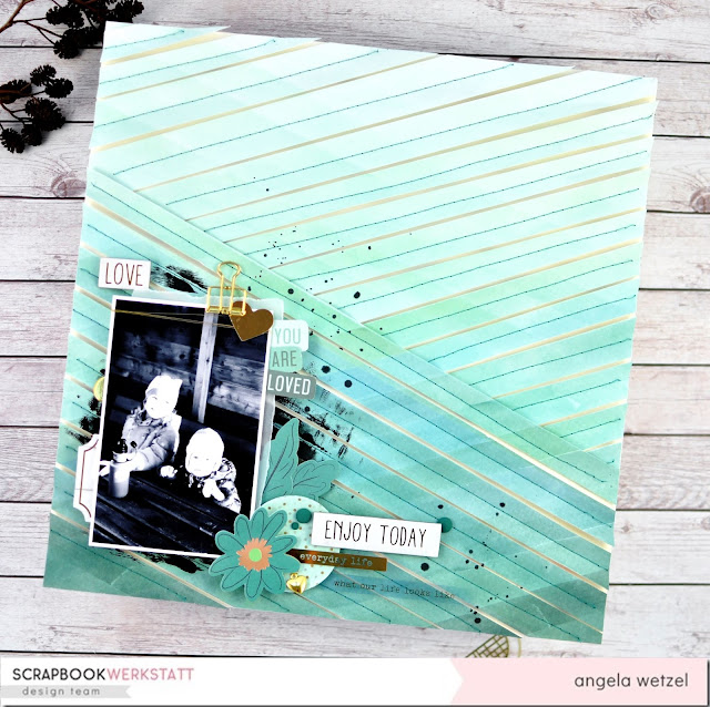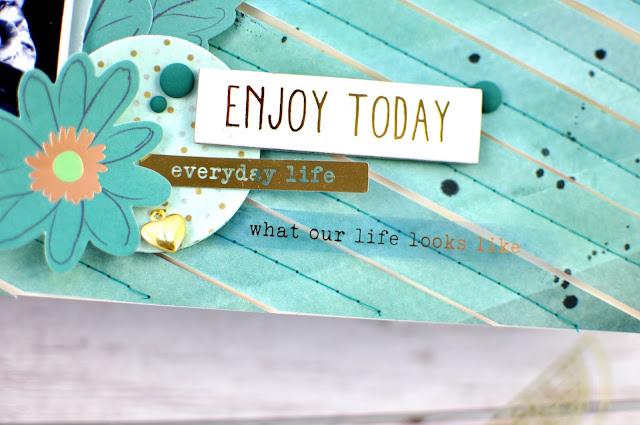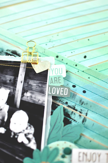 Das Papier habe ich in Streifen geschnitten und aufgenäht so bekommt das Layout ganz viel Struktur. Dann mit etwas schwarzer Acrylfarbe gematscht und die Embellis ergänzt. Mehr braucht es heute nicht. 😉