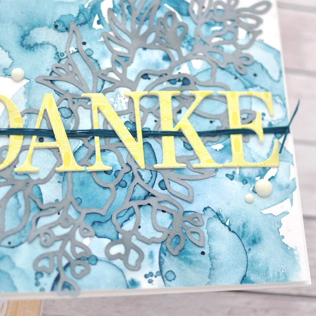 Der Hintergrund der blauen Karte ist mit Aquarellen gemacht. Immer eine tolle Möglichkeit effektvolle Hintergründe zu gestalten.