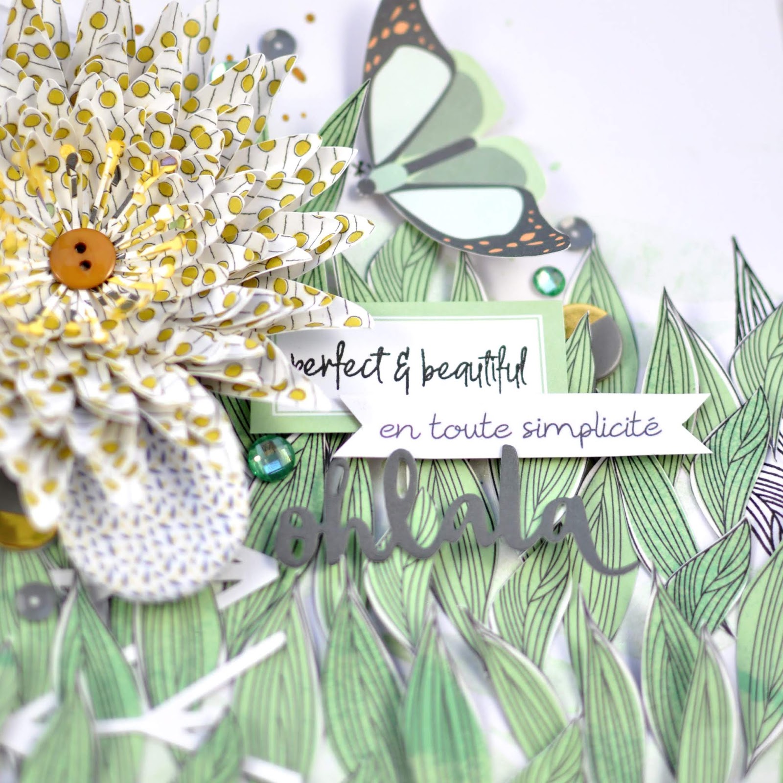 ohlala….Béa vient de sortir une très belle nouvelle collection. Ce vert menthe aux feuilles, un rêve ! J’ai juste dû le couper. Ce qui est pratique, c’est que j’ai utilisé le reste de la pièce comme pochoir pour la mise en page.