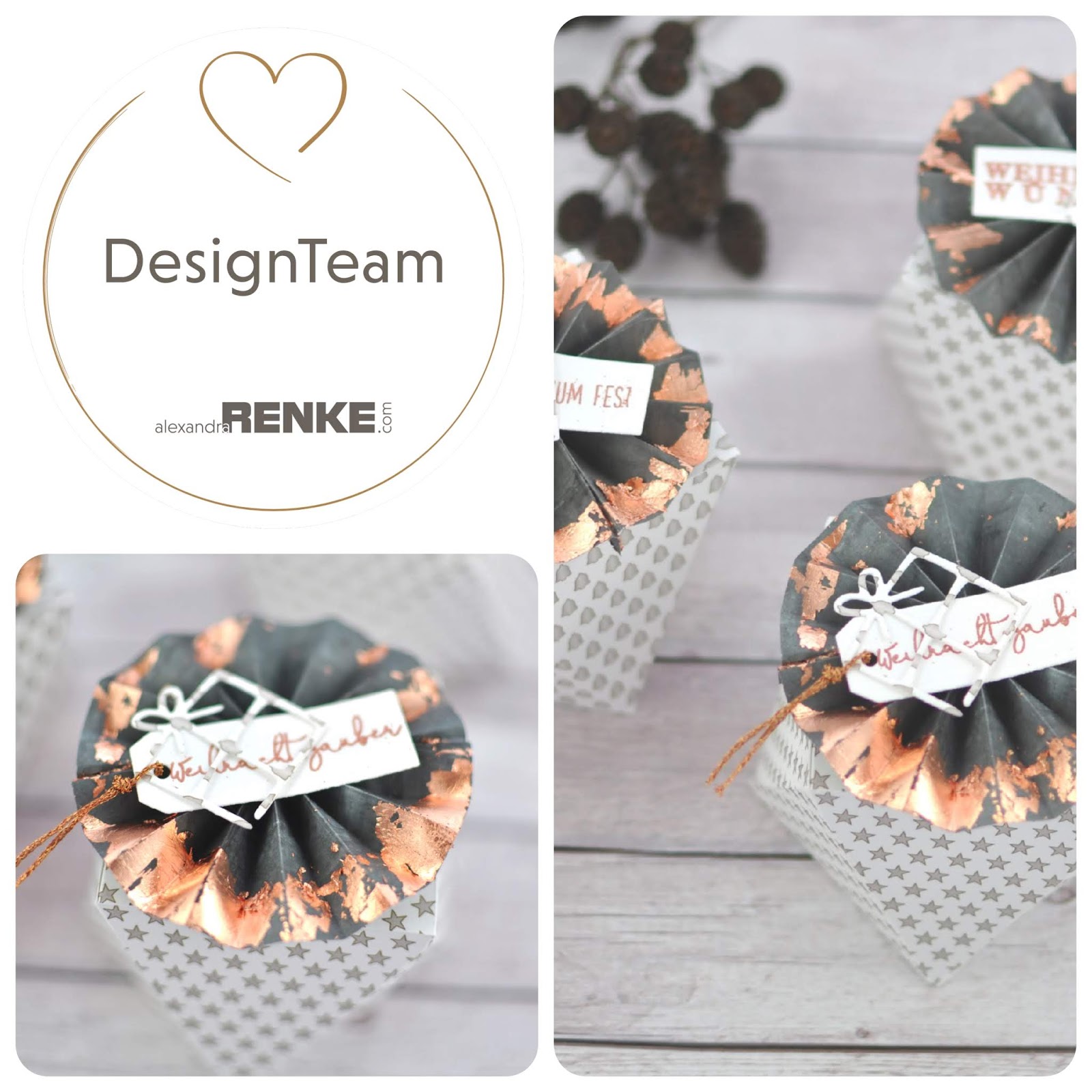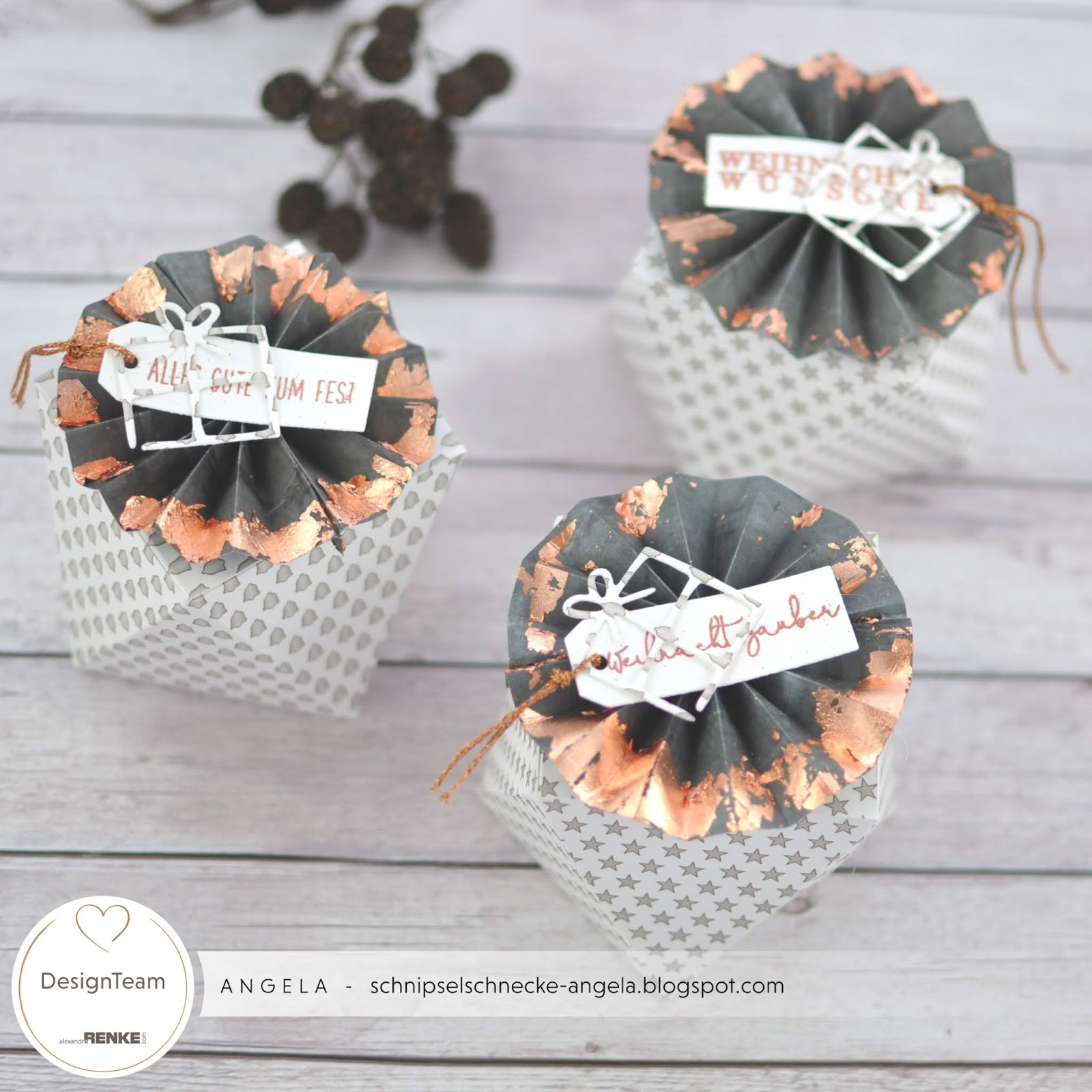 Die Rosetten haben es mir angetan, ihr ahnt es schon.:) Um hier den Stand des Kindergartens am Weihnachtsmarkt zu unterstützen habe ich unter Anderem diese schönen und schnellen Diamantboxen gemacht. Sie gehen schnell und sehen so raffiniert aus. Dazu noch ein paar Rosetten und ein embosseder Gruß und fertig ist die Kiste. Die tollen Papiere von Alexandra Renke findet ihr hier und und hier und vor allen Dingen die etwas dünneren auf beiden Seiten bedruckten Papiere findet ihr hier, daraus habe ich die Rosetten gemacht.