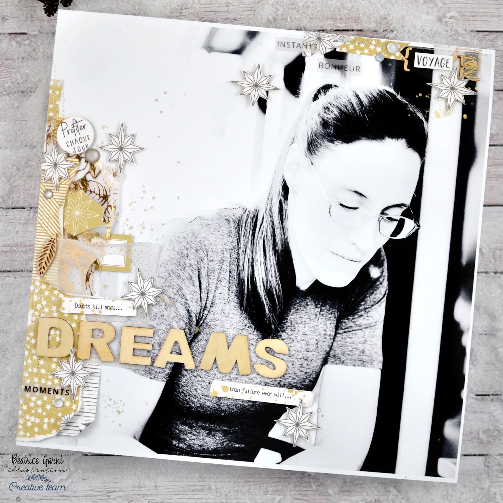 Heute gibt’s ein Big Picture Layout für euch mit den wunderschönen Winterpapieren und Stempeln von Béa. Ich hatte mal Lust auf was Verträumtes… kennt ihr den Spruch? Ist soviel Wahres dran oder?