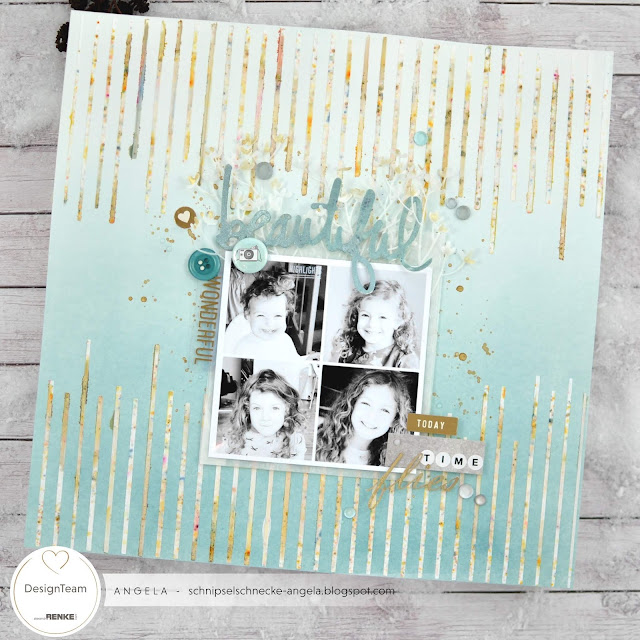 Dazu habe ich mit der Silhouette eine Schablone gemacht mit lauter dünnen Streifen. Dann mit weißer Strukturpaste aufgetragen und noch während die Schablone drauf liegt und noch alles feucht ist mit dem goldenen Magical alles bestäubt. Dann zum Schluß noch besprüht mit etwas Wasser und die Schablone vorsichtig runter nehmen. Gut trocknen lassen!! Ich liebe diesen Effekt. Oder was meint ihr? Habt ihr das so schon mal probiert?