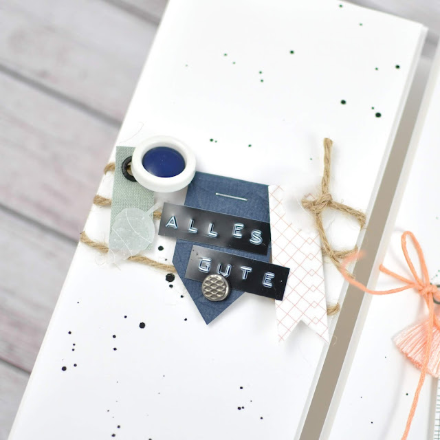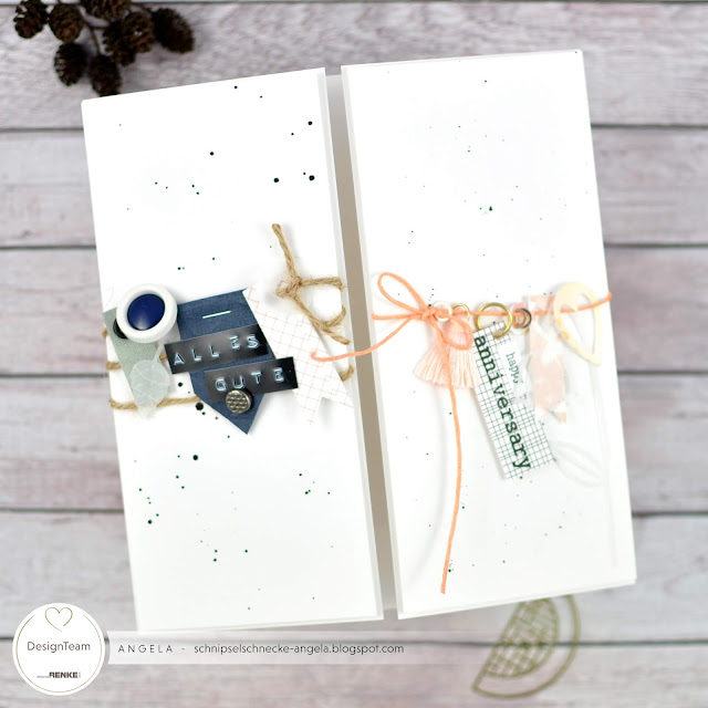 …feiern braucht es eine Doppelkarte. Ich habe mich von der lieben Claudi inspirieren lassen und eine Karte mit zwei Seiten gestaltet. Eine für IHN und eine für SIE. Der Hintergrund ist ganz einfach nur mit schwarzer Tinte besprenkelt und die Embellis schön klischeemäßig auf Mann und Frau aufgeteilt.:) Ich finds hübsch und ihr?