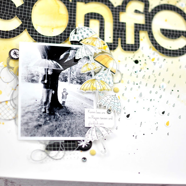 Etwas Aquarell hier und da, ein paar Wölkchen, ein paar Tröpfchen und den Regenschirm natürlich nicht vergessen. Die tollen Papiere und das schöne karierte Washi sind aus dem Hause Renke.