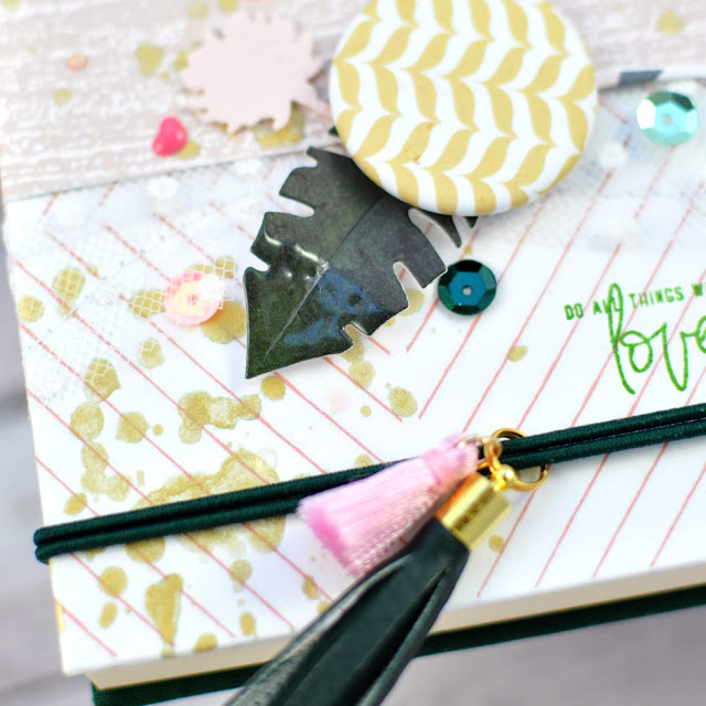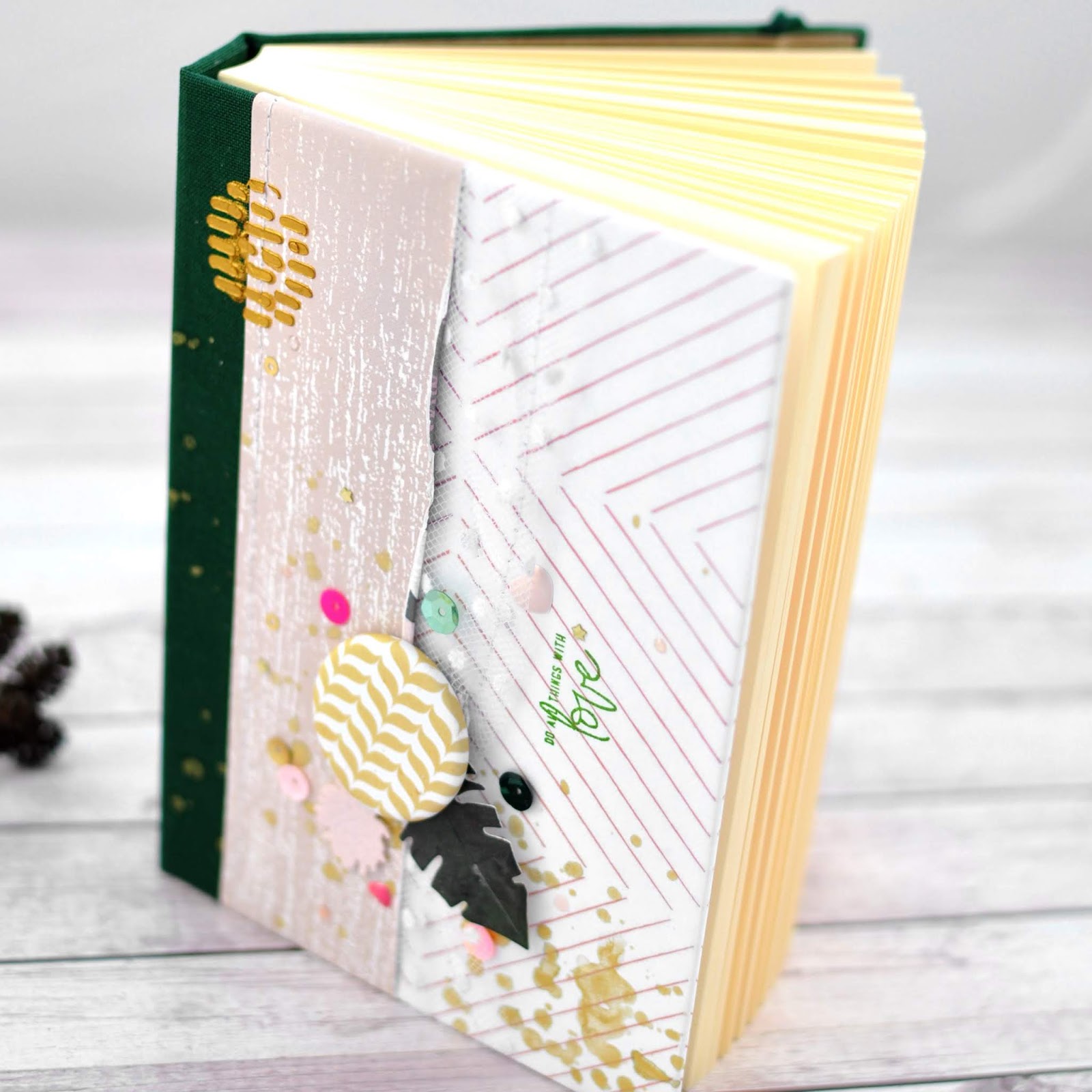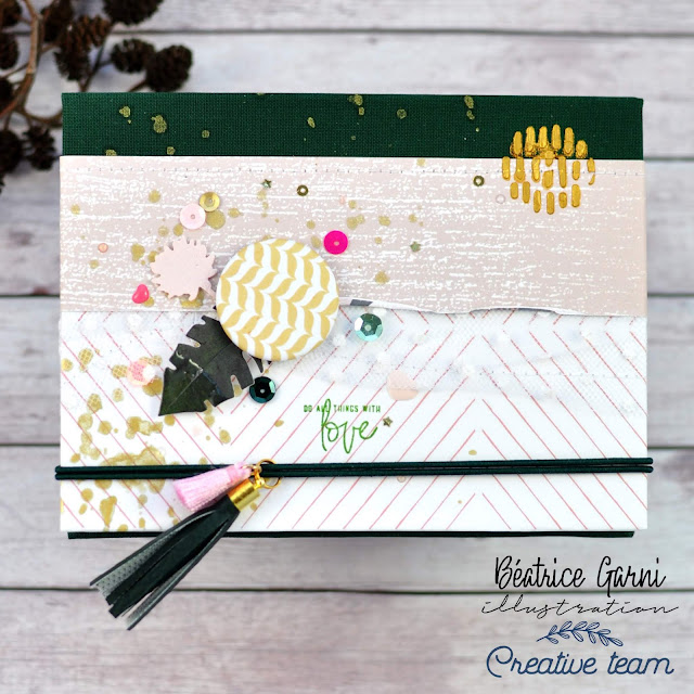 J’adore cette combinaison de couleurs, vert foncé, rose, or…….Un petit carnet a été créé avec des papiers de la collection „Comme un air de printemps“ de Béatrice.