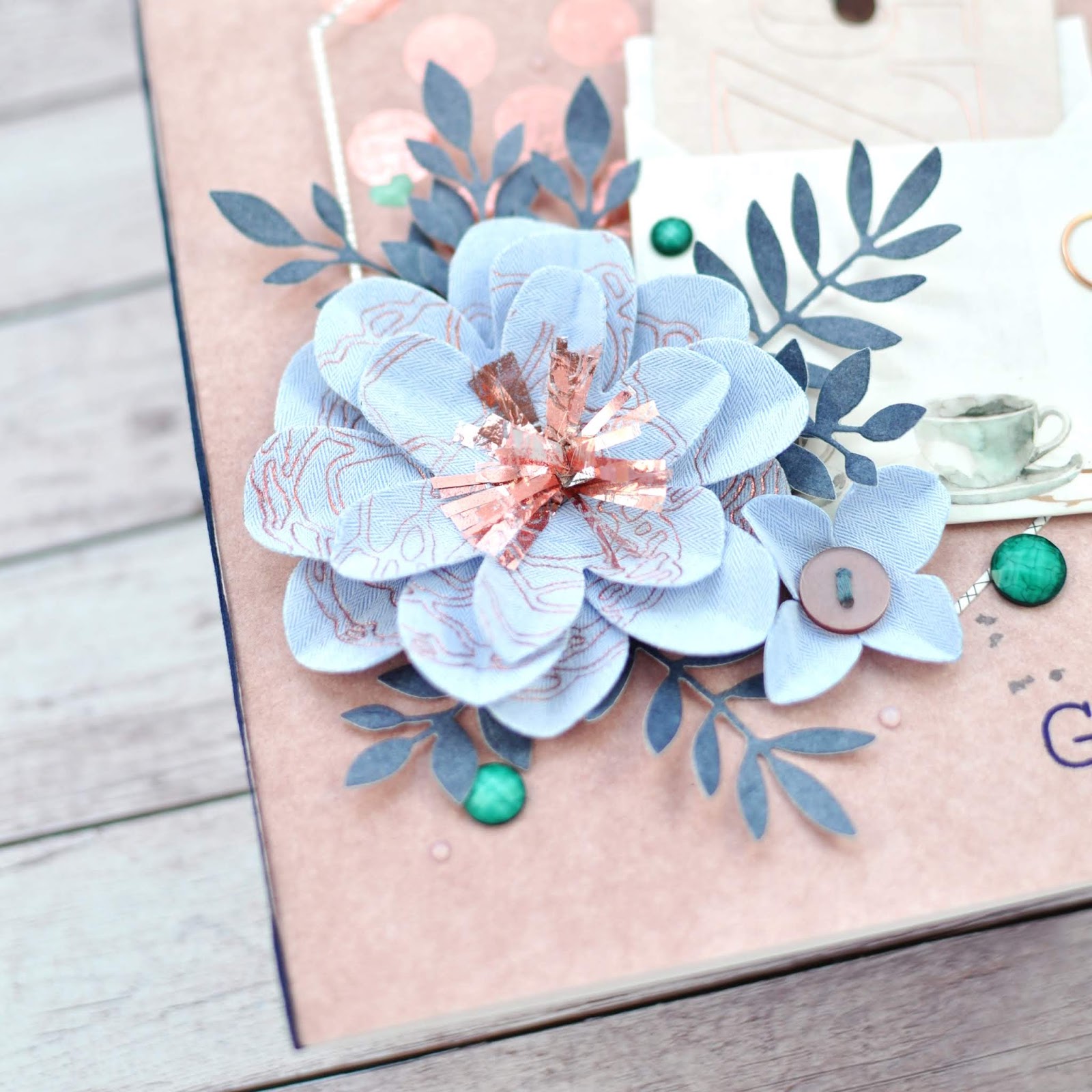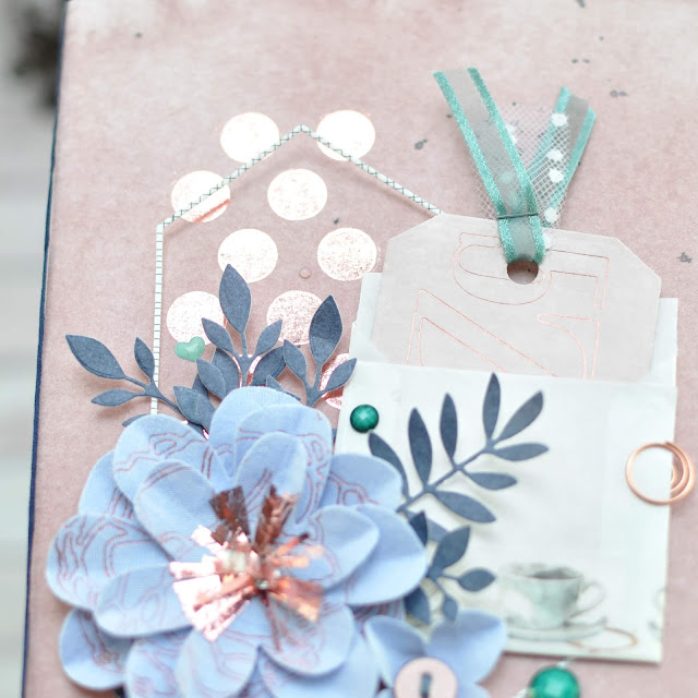 Das Tolle ist, dass im Grunde alle Materialien zum folieren geeignet sind. Die Blume habe ich z.b. mit einer stinknormalen Stanze foliert und dann die Blütenblätter ausgestanzt. Den Rest der Folie habe ich einfach für die Blüttenmitte eingeschnitten und gerollt.