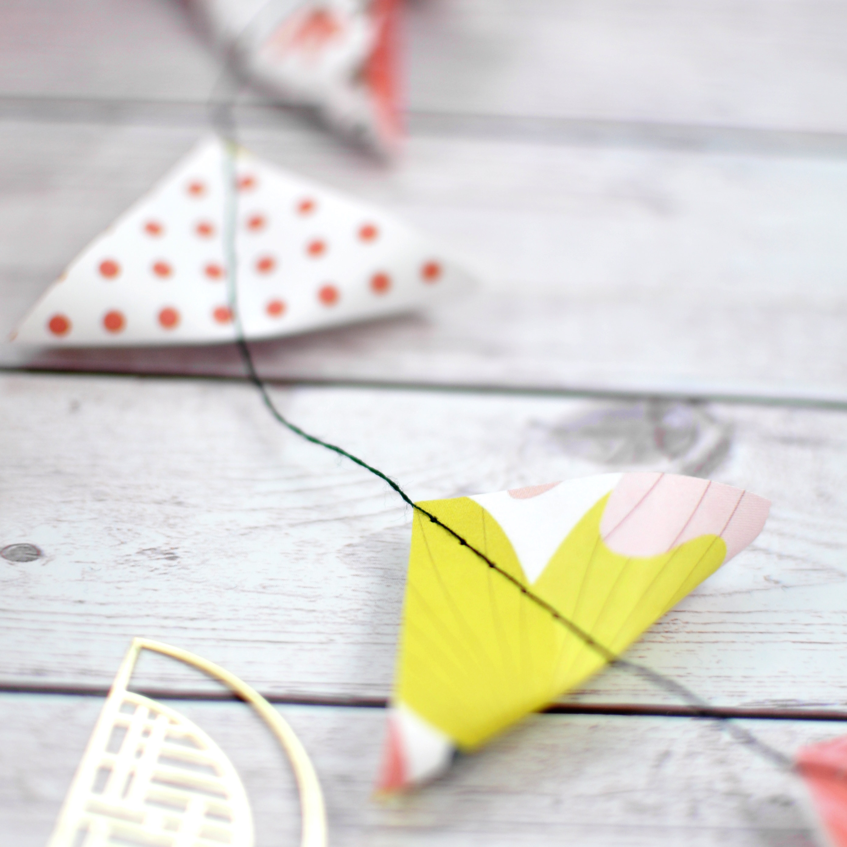 Für die schöne Girlande habe ich einfach Quadrate genommen, Spitze auf Spitze leicht gefaltet und alle hintereinander durch die Nähmaschine gejagt. 🙂