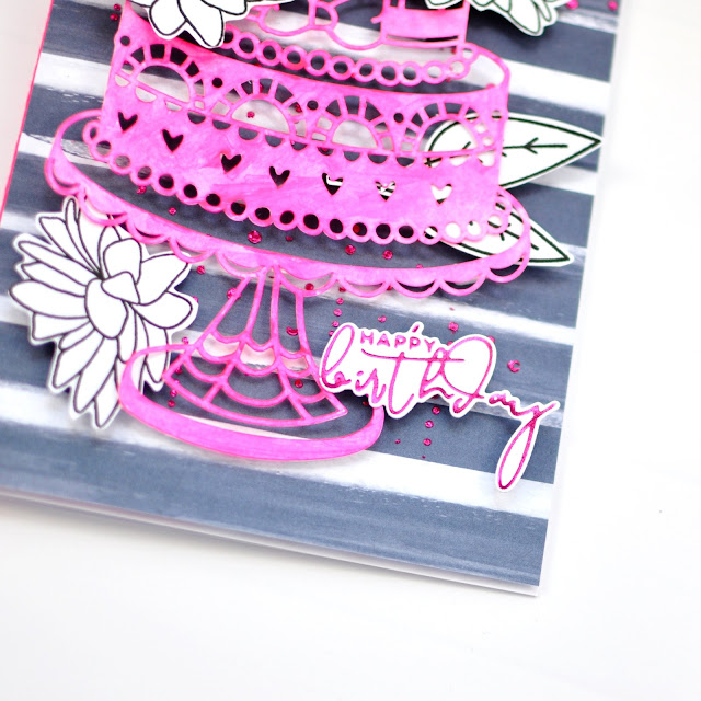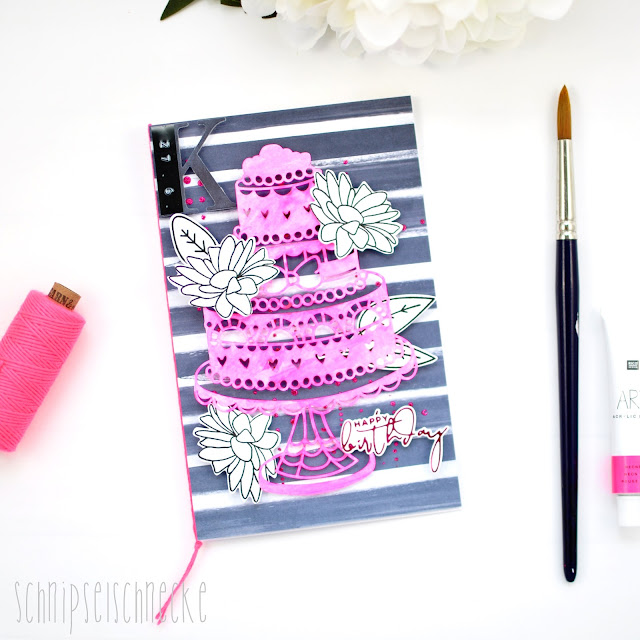 Torte zum Frühstück oder so ähnlich. 🙂 Bin ja nicht die einzige die am 27. Geburtstag hat da gibt es eine Menge mehr und diese schöne Karte ging ebenfalls an ein Geburtstagskind. Gewünscht war Pink, nichts leichter als das. Die tollen Acryl Farben von Rico Design sind aber auch intensiv. Ihr findet sie in der Erlebniswelt von Alexandra Renke. Mit der Acrylfarbe habe ich die Torte koloriert, eine Schnittdatei von Paige Evans. Hab sie noch ein bißchen abgeändert weil ich die Torte viel viel kleiner ausgeschnitten habe als das Original.