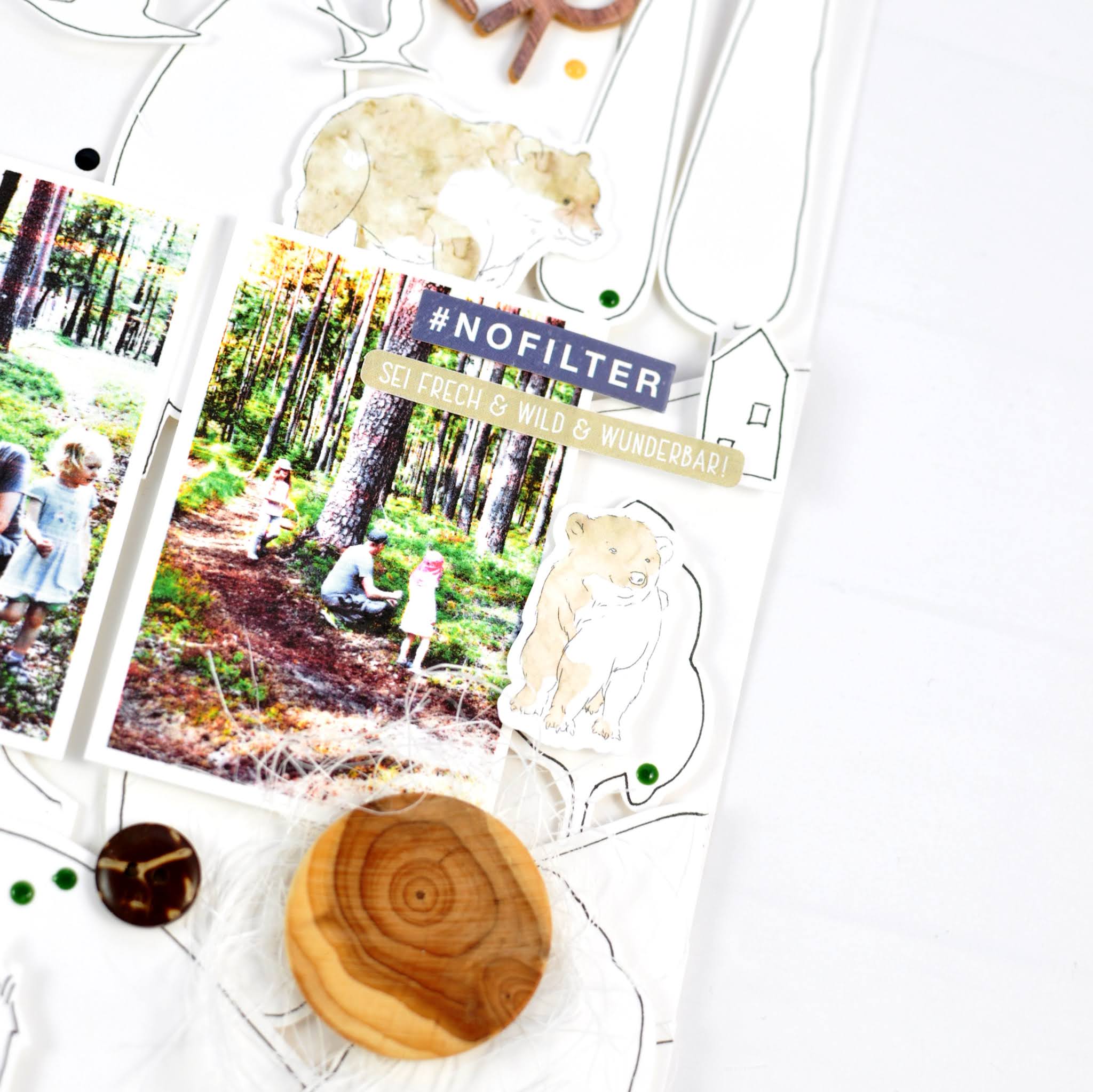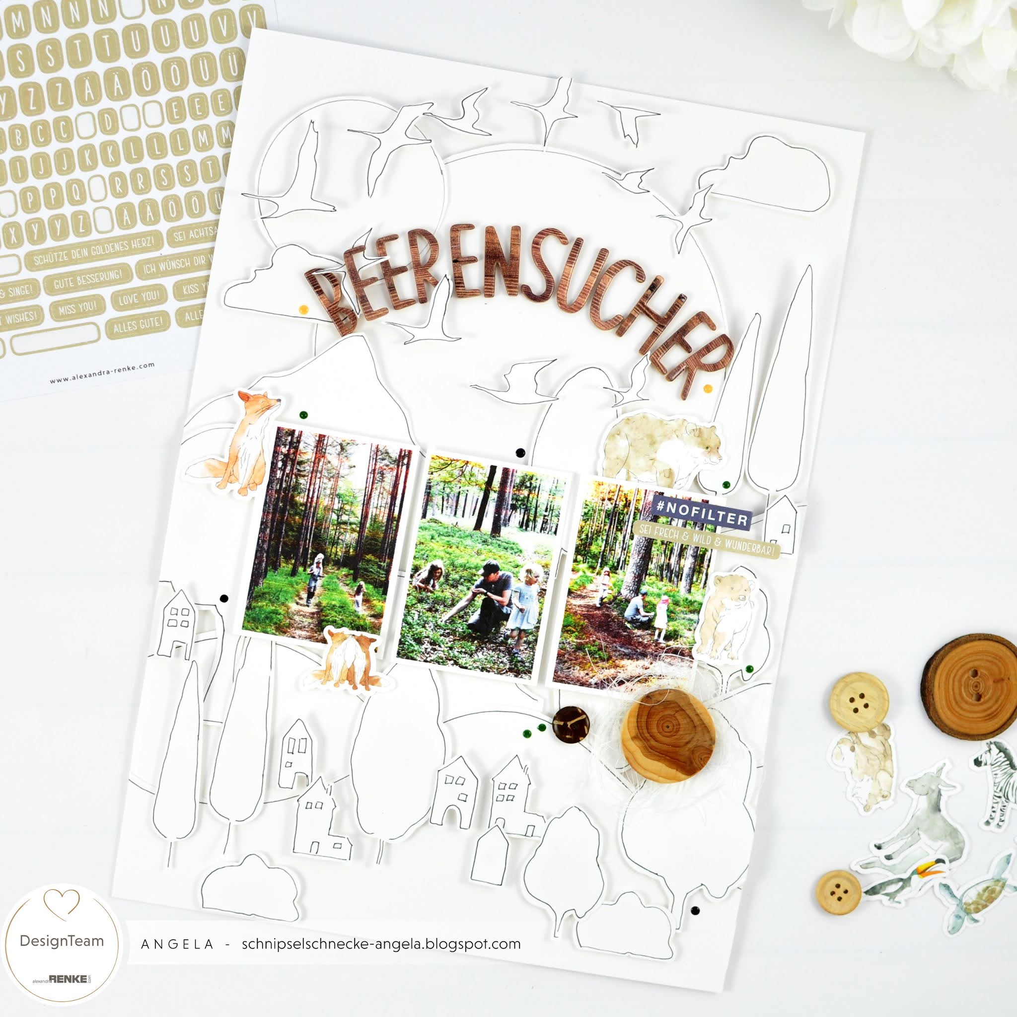 Ein bisschen geplottet und ein bisschen gezeichnet, manchmal braucht es nicht mehr für ein Layout. Die süßen Waldtiere von Alexandra Renke durften auch noch mit drauf und meine fleißigen Heidelbeerpflückerinnen. 🙂