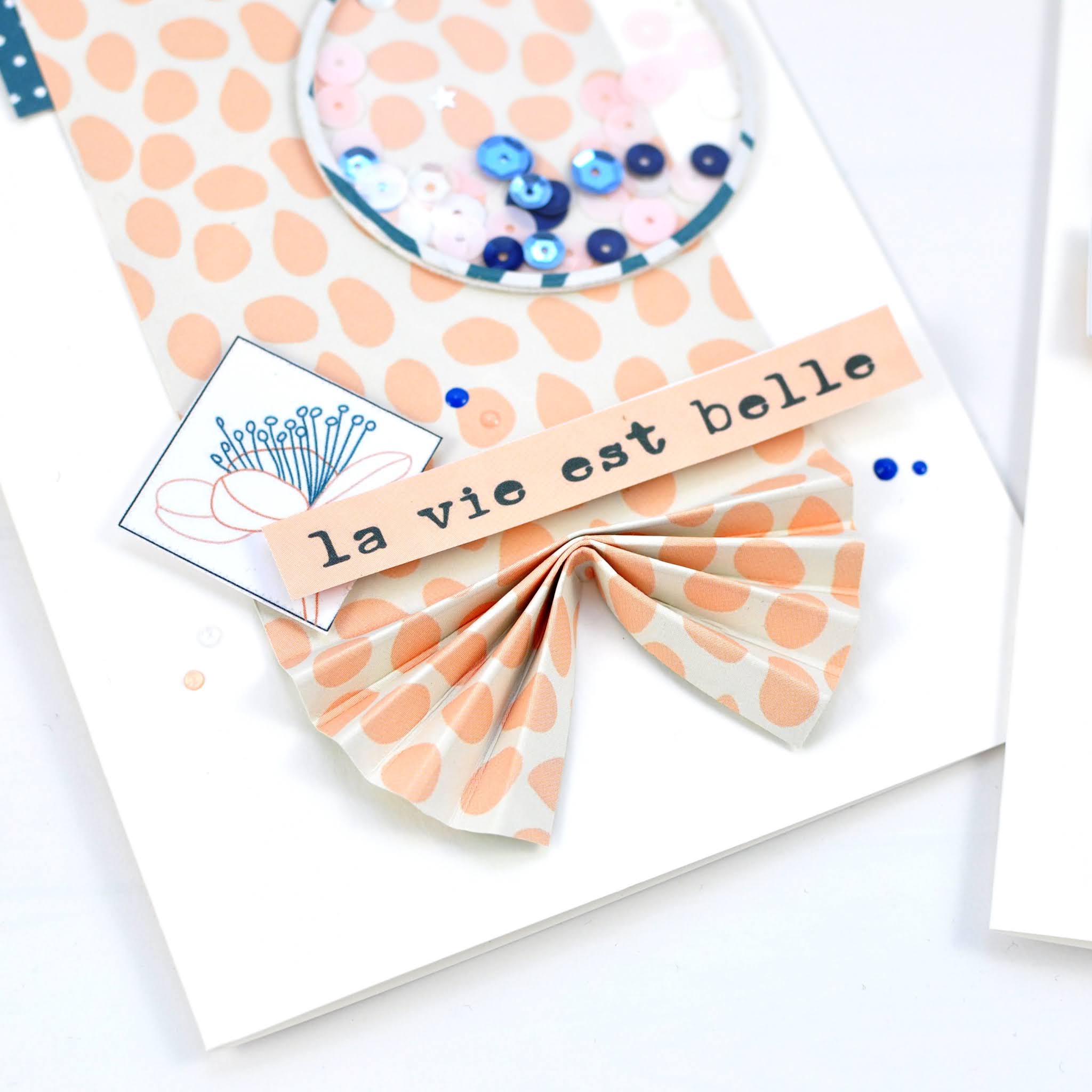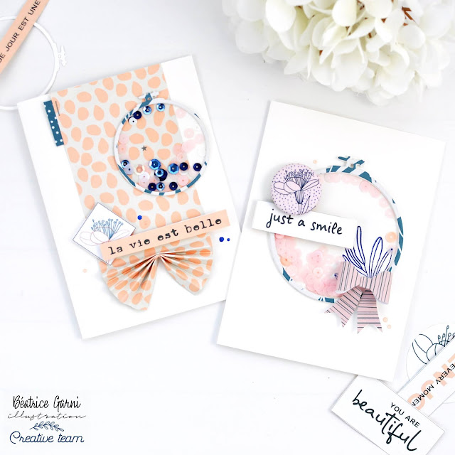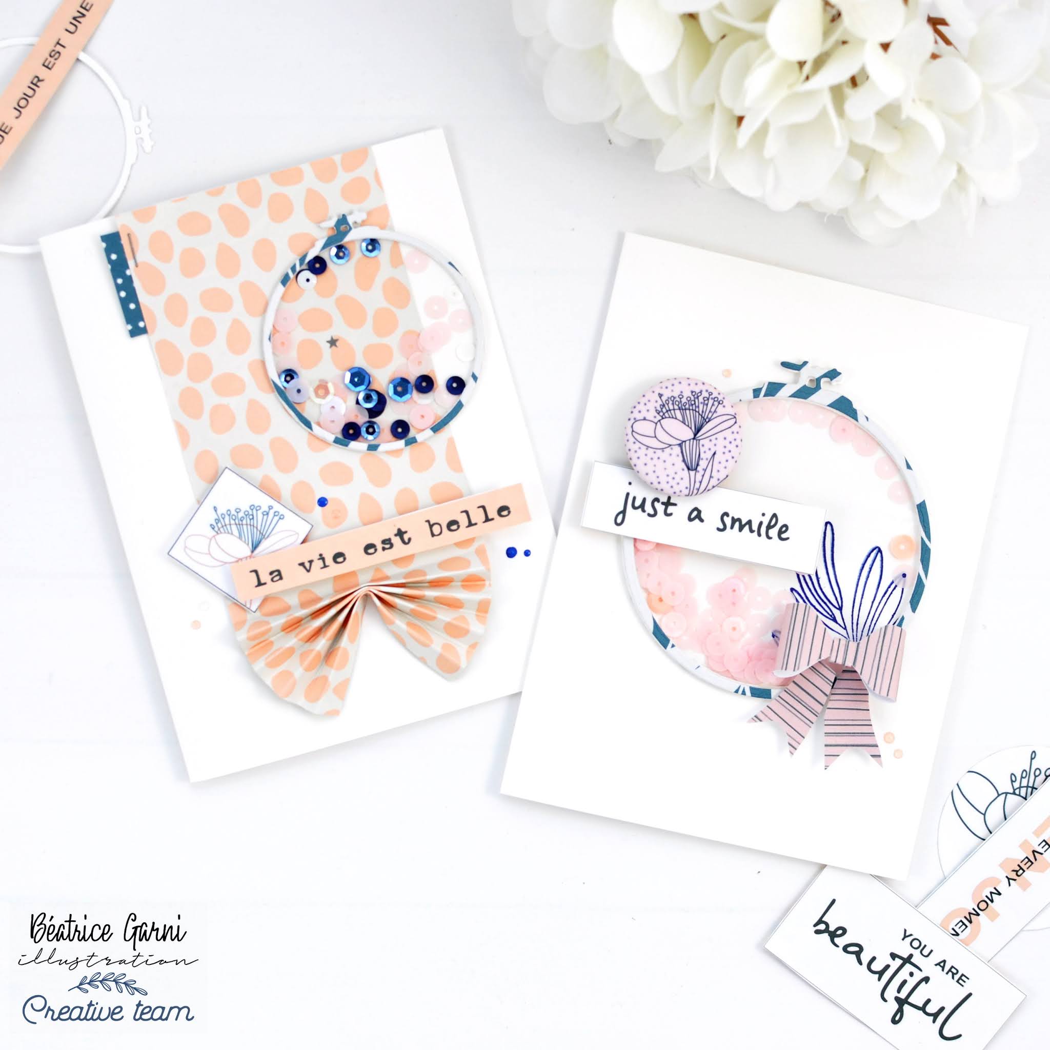 J’ai utilisé le magnifique cadre de broderie de Karine et je l’ai transformé en élément de shaker. Il en résulte deux petites cartes avec la nouvelle collection de Béatrice Garni „La vie est belle“.