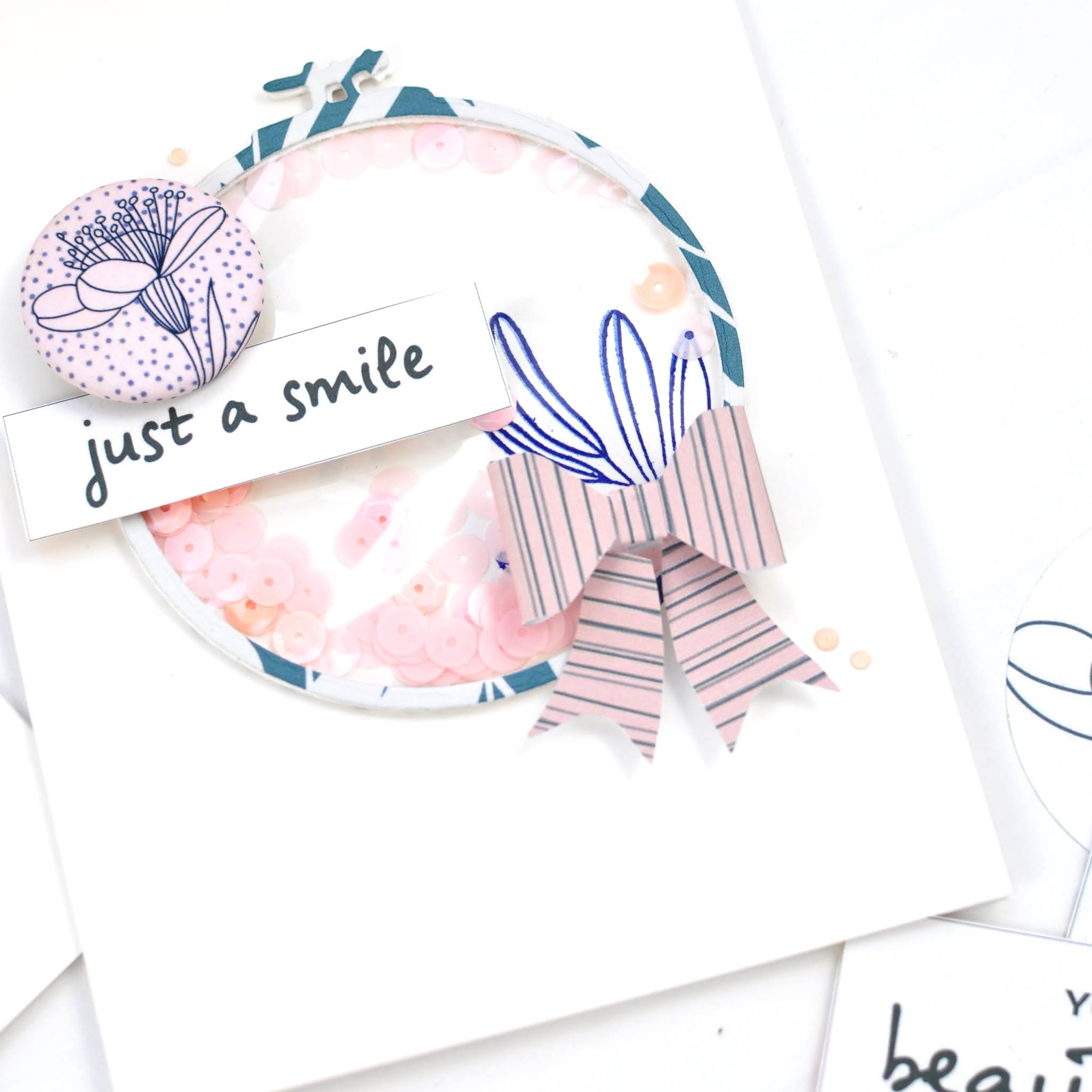 Ich habe den schönen Stickrahmen von Karine verwendet und ihn zum Shakerelement umfunktioniert. Entstanden sind so zwei kleine Kärtchen mit der neuen Kollektion von Béatrice Garni „La vie est belle“.