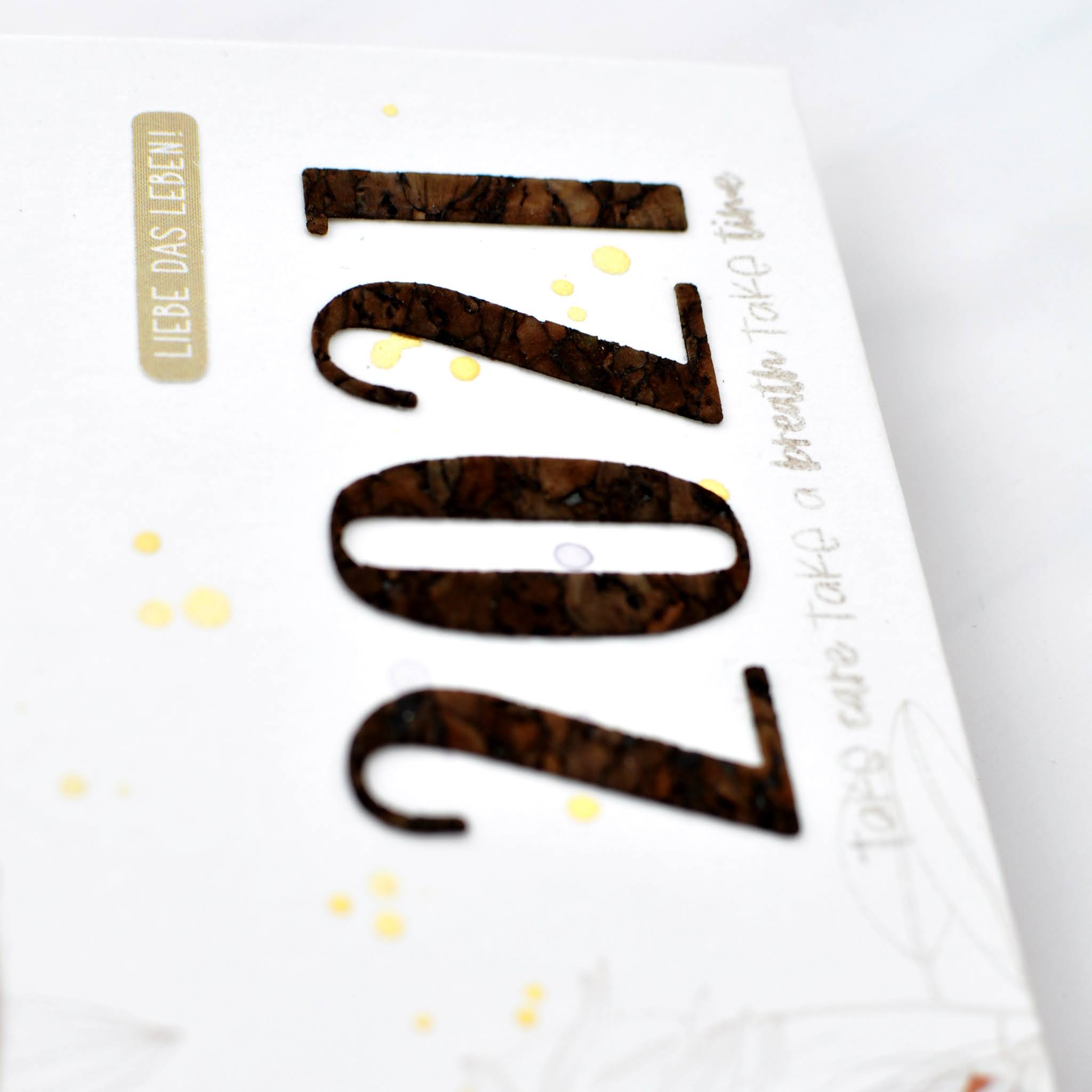 Verziert habe ich das ganze noch mit einem tollen Stempel und Zahlen aus Kork. Und, vielleicht seht ihr es auf dem Bild, ich habe noch am Ăbergang zwischen Kork und Papier dĂŒnnes goldenes Garn gespannt als Highlight.