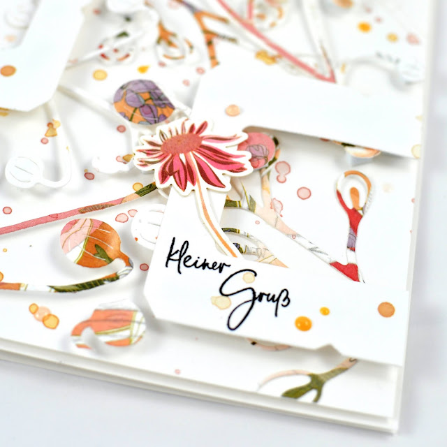 Hier habe ich aus dem Designpapier mehrfach Blätter ausgestanzt und die Blätter auf der Karte mit 3D Klebepunkten verteilt. Als Grundlage für den Stempel habe ich mir die Memorie Rahmen genommen, ein paar Farbspritzer, noch ein Blümchen aus dem Figurine Bogen dazu und mehr braucht es nicht. Oder?
