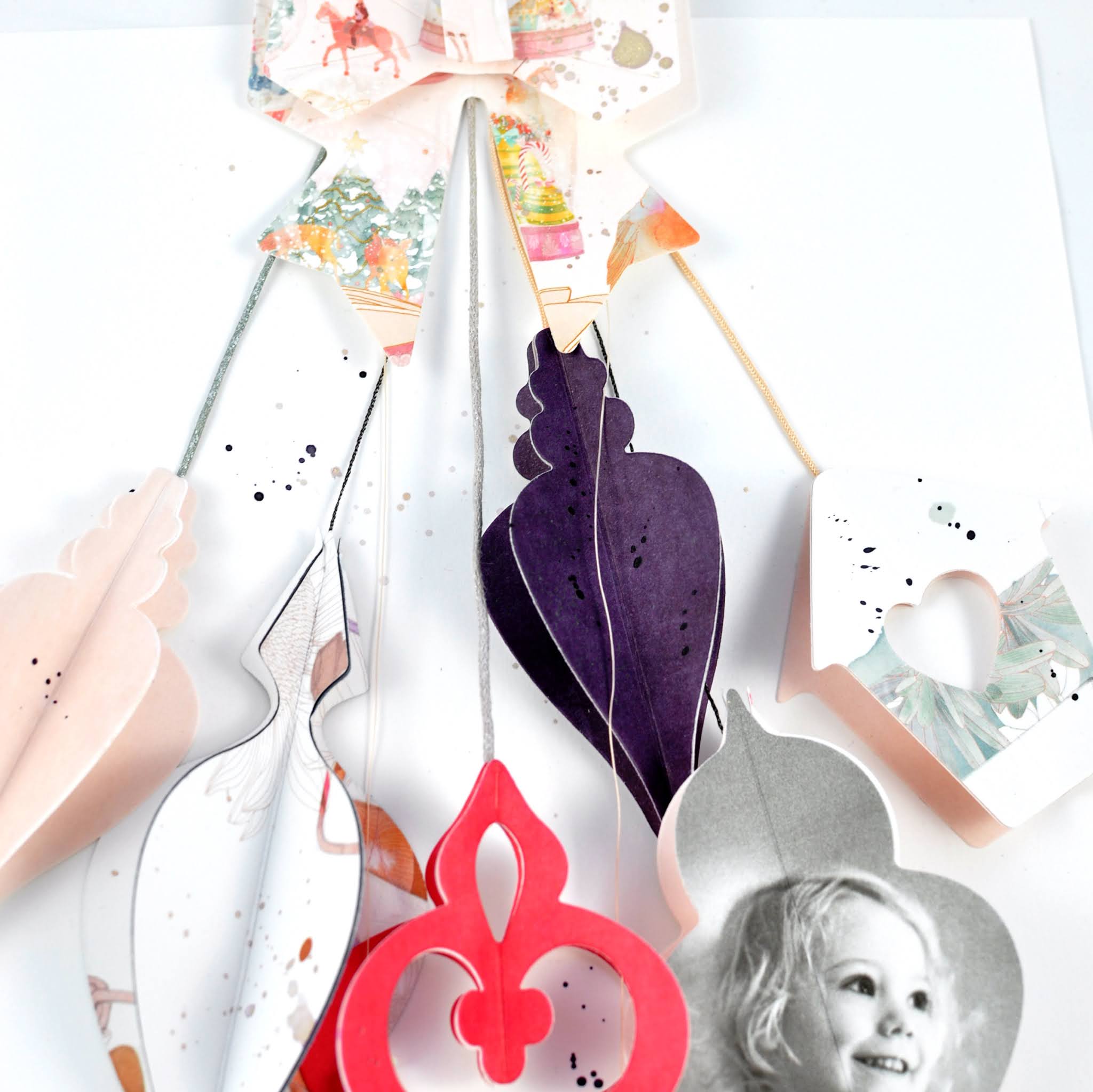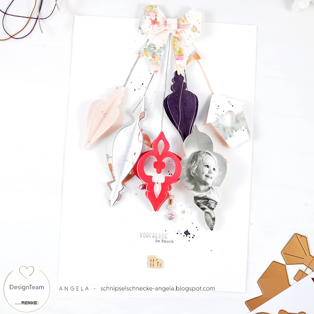 Auch Weihnachtssachen gehen spitzenmäßig für ein Layout. Ihr habt bestimmt schon die tollen Ornament Hänger von Alexandra Renke gesehen. Auch sowas kann man auf einem Layout verwenden. Hier habe ich einfach ein Foto ausgestanzt und lass die Ornamente von oben runterbaumeln. Ich habe natürlich keine 5 oder 6 Ornamenthälften aneinander geklebt, sonst sprengt das mein Layout Ordner. Gerade so viel das es dreidimensional wirkt. Ich hoffe euch gefällt’s….!