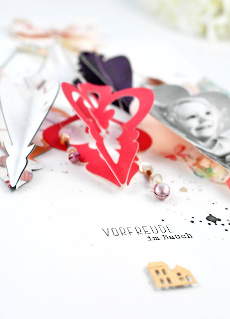 Dieses Layout ist übrigens in Rösrath entstanden. Alexandra und ihr Team hatten schon fertig ausgestanzte Ornament Teile die sie mal zu Testzwecken gemacht hatten. Das kam wie gerufen denn sie waren alle schon wunderbar in den richtigen Farben daher ging das wirklich fix. Ein paar Perlen aufgefädelt und mit dran gehängt.