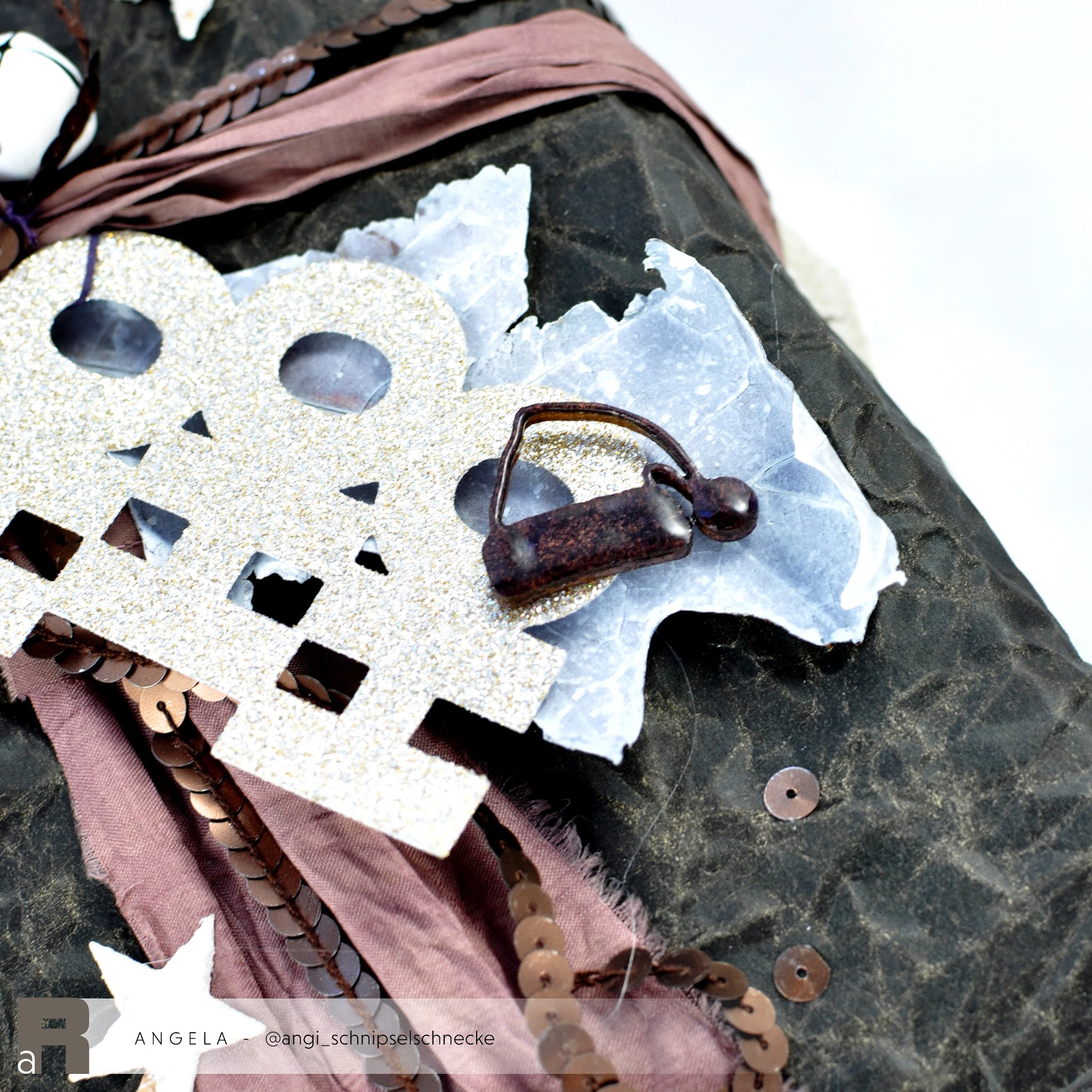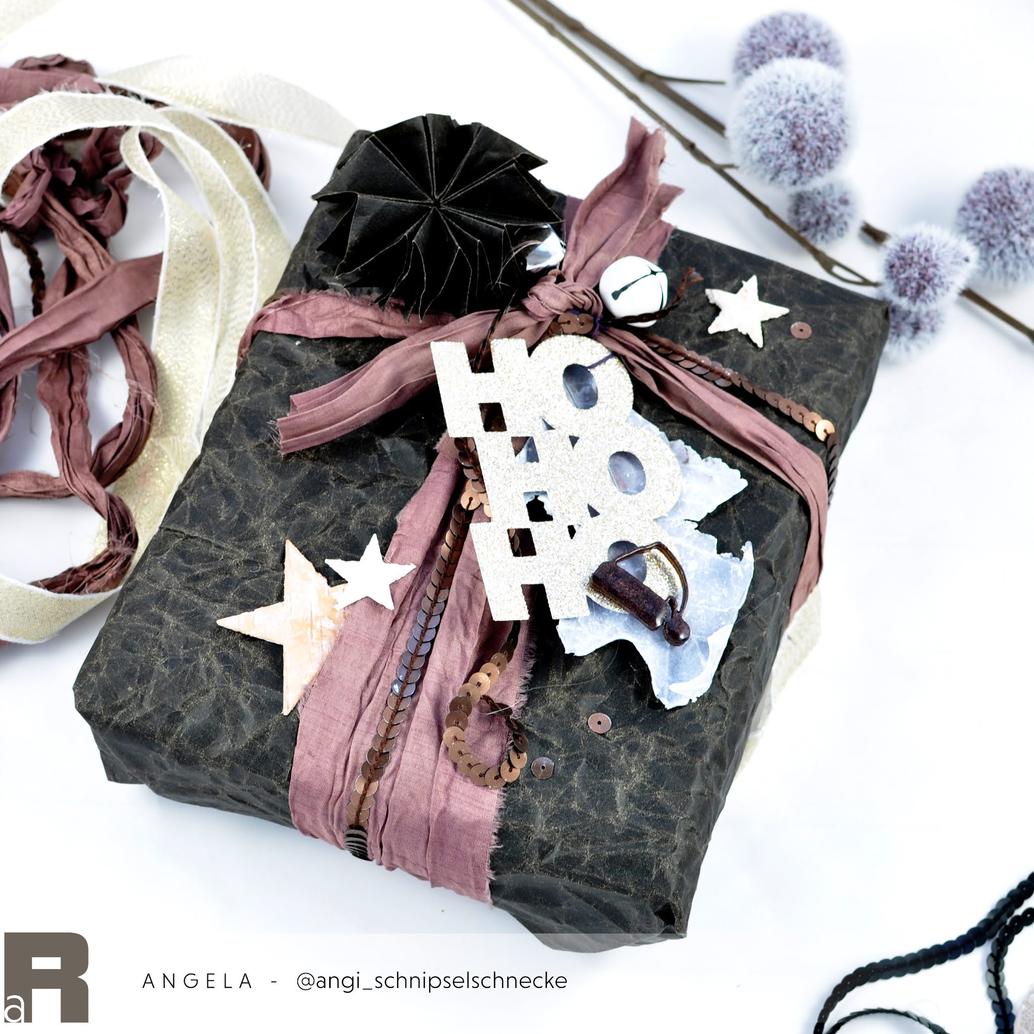Mein Geschenk ist hier mal richtig opulent eingepackt in Wachspapier mit viel Glitzer und viel Deko drauf. Da traut man sich gar nicht es zu öffnen. 🙂 Aber es hat Spaß gemacht mal zu klotzen und nicht nur zu kleckern. Oder was meint ihr?