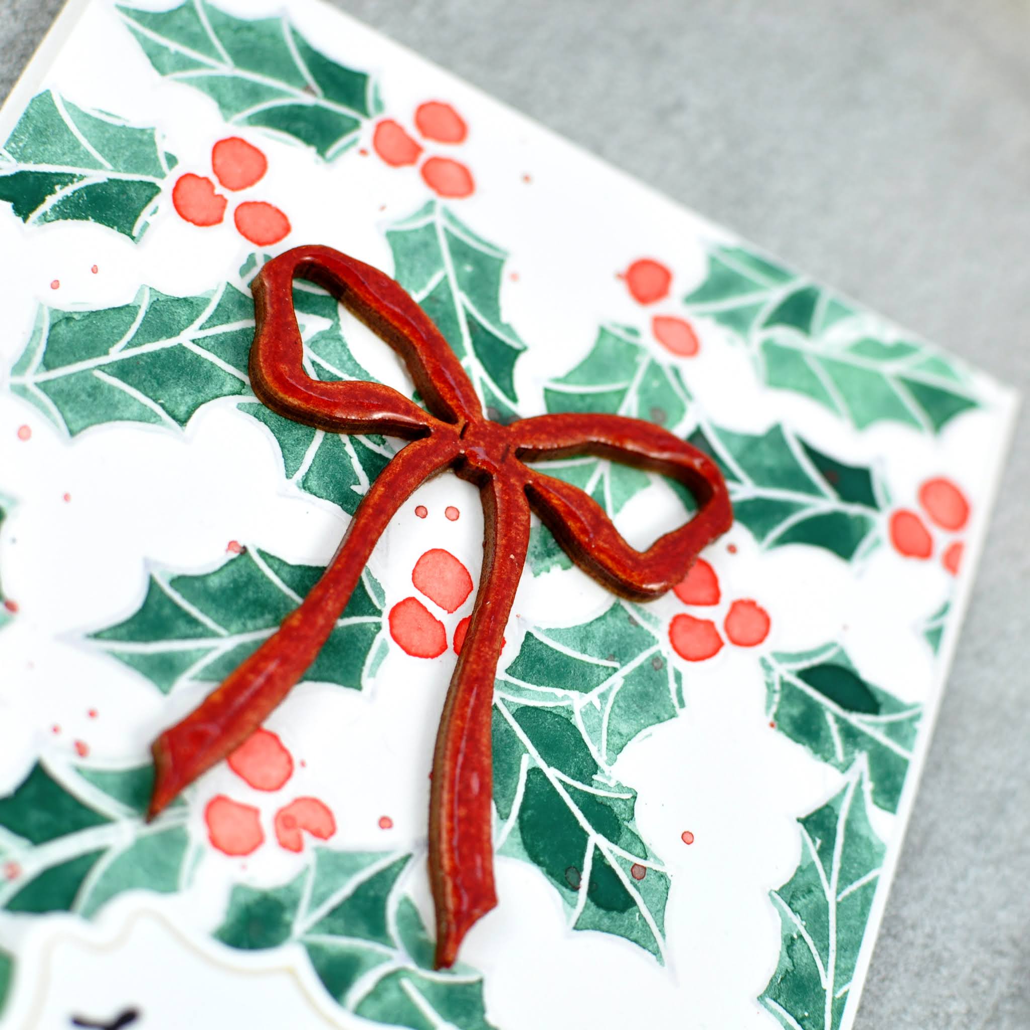 Êtes-vous plutôt du type classique de Noël ou plutôt du type moderne ? Je dois admettre que je peux aussi faire du rouge et du vert, mais je préfère d’autres couleurs de Noël. Cependant, j’ai dû utiliser ce timbre de houx et en fait en rouge et vert. 🙂 Ça se passe bien, ou qu’en pensez-vous ?