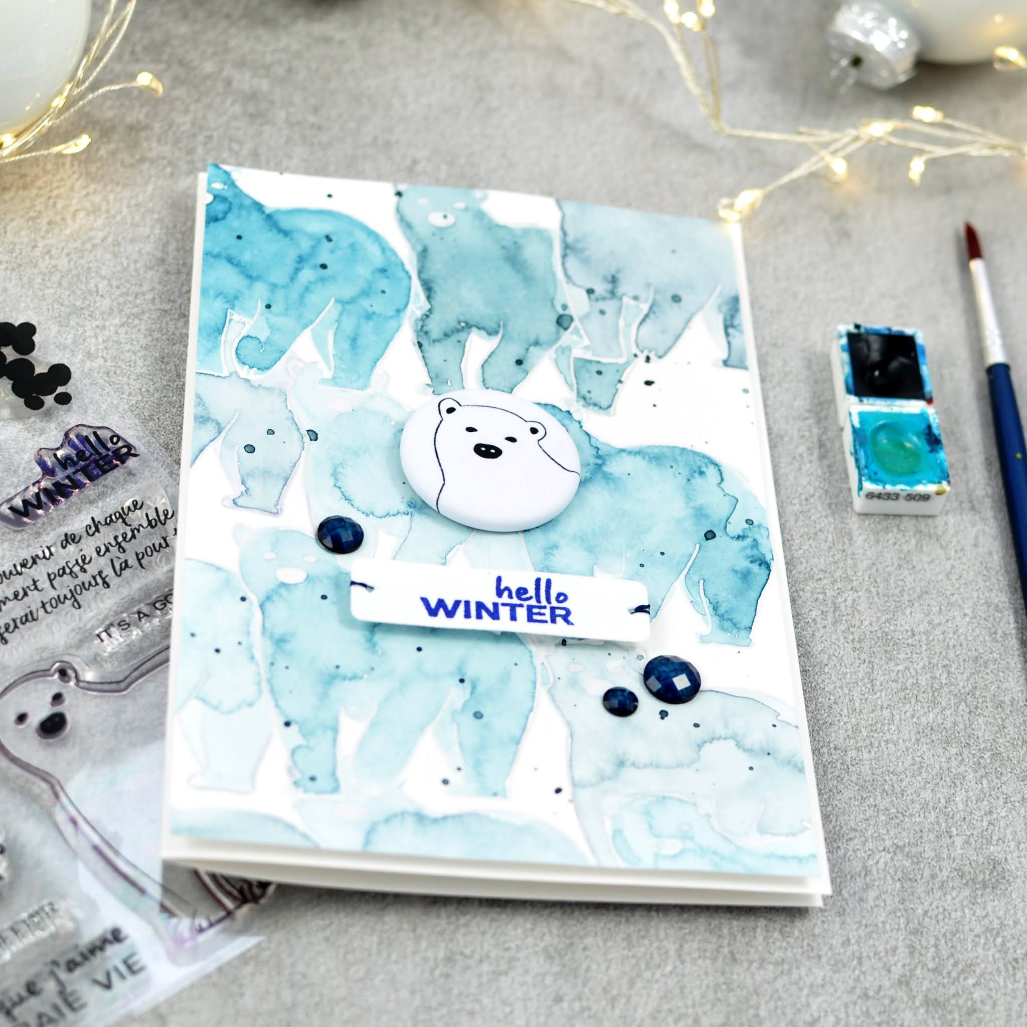 Pour l’arrière-plan, j’ai embossé les tampons de Béatrice avec de la poudre à embosser transparente et j’ai utilisé une technique de masquage pour pouvoir tamponner les tampons les uns sur les autres. J’ai ensuite pris un peu de peinture dans ma boîte d’aquarelle. C’est également ainsi que la carte des ours polaires a été créée. Bien que mon préféré soit en fait le rouge-vert. 😉