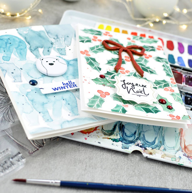 Für den Hintergrund habe ich die Stempel von Béatrice mit klarem Embossing Pulver embossed und eine Maskiertechnik verwendet damit ich die Stempelabdrücke übereinander stempeln konnte. Dann tief in meinen Aquarellkasten gegriffen und ein bißchen ausgemalt. So ist auch die Eisbären Karte entstanden. Obwohl mein Liebling tatsächlich die rot grüne ist. 🙂
