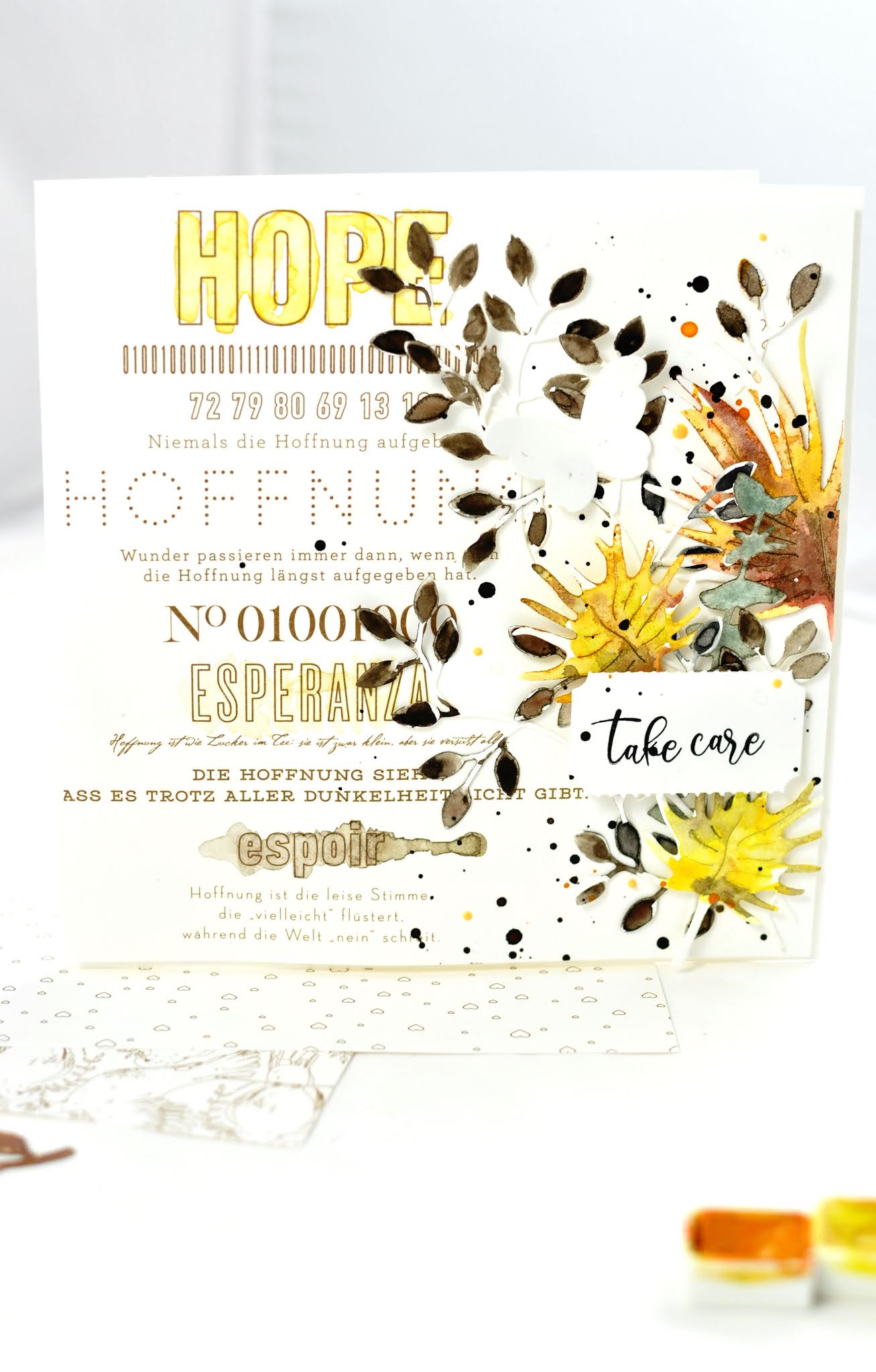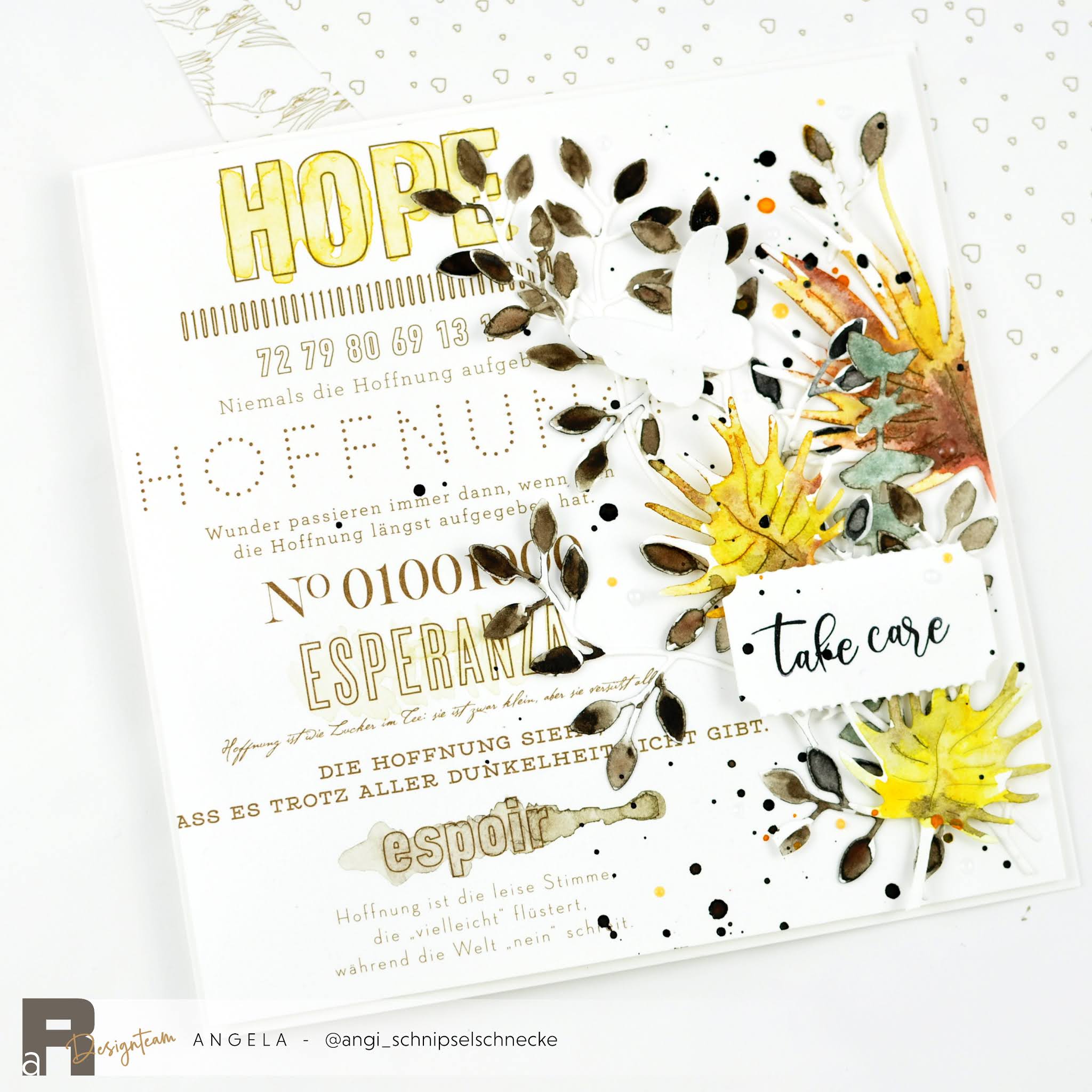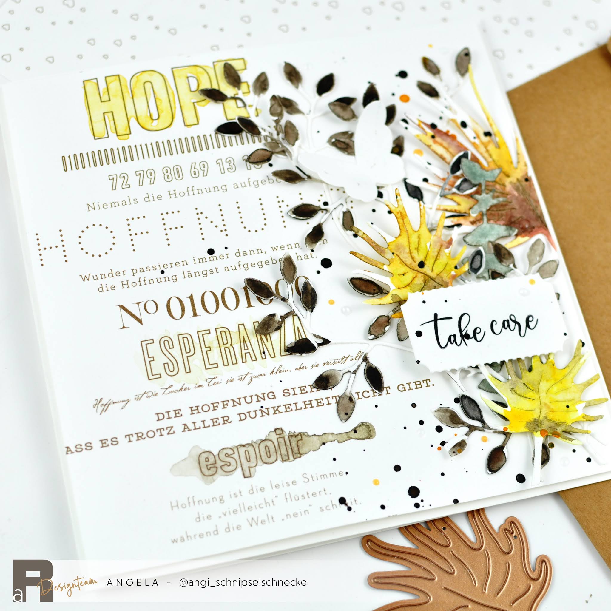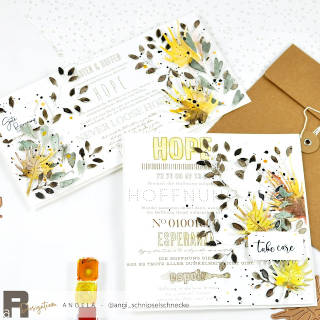 Dieses schöne „Hope“ Papier von Alexandra Renke ist mir gleich beim Auspacken in die Hände gefallen. Ich war fest davon überzeugt das ich da ein Layout draus mache. Aber „Suprise Suprise“ es sind zwei Genesungs-Karten geworden. Die kann man momentan sicher gut gebrauchen!