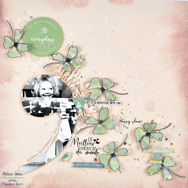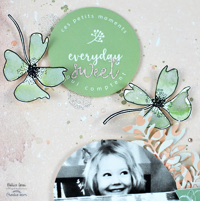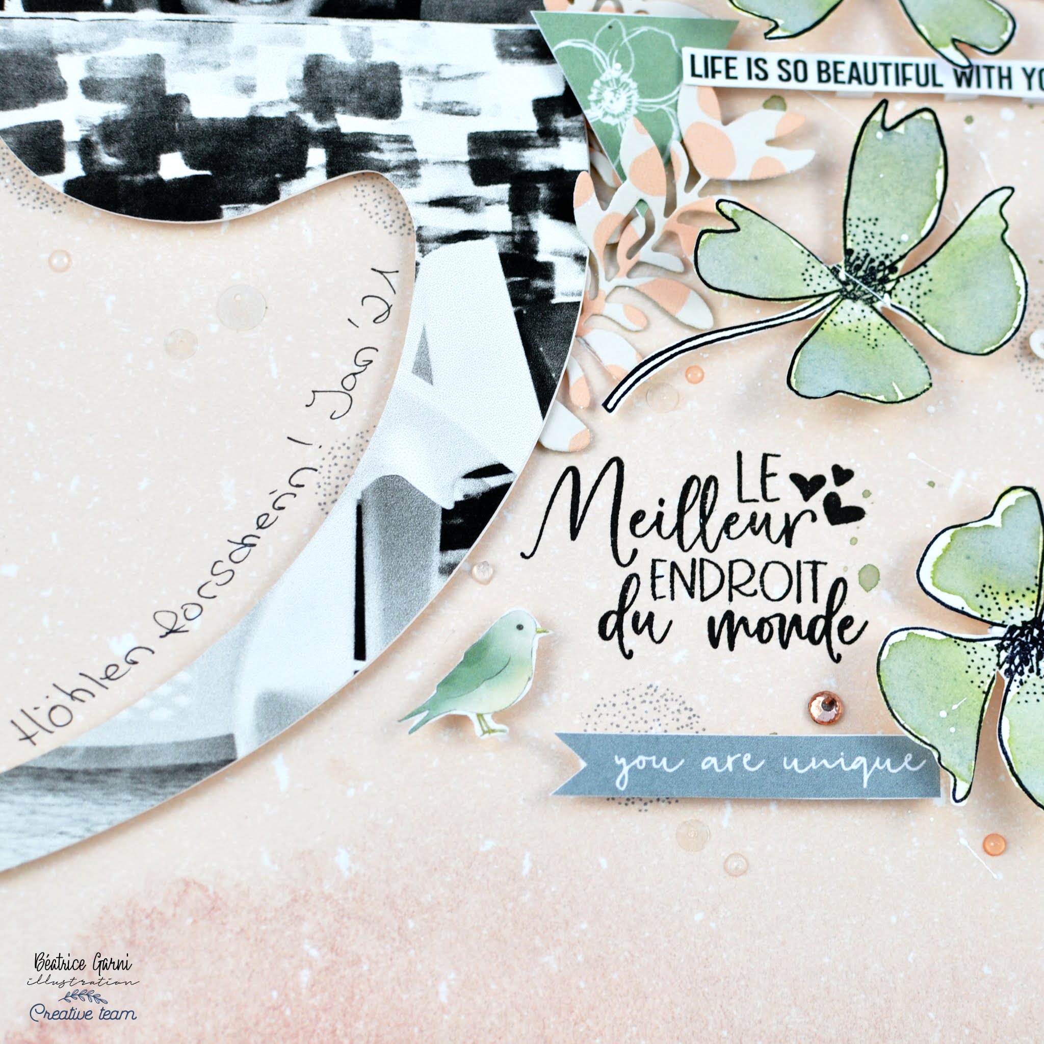 Das Layout ist mit der neuen Kollektion „un si beau moment“ von Béatrice Garni entstanden. Und diesmal gibt es auch ein paar Stanzen dazu. Die Farben sind einfach ein Traum, super zart und leicht.