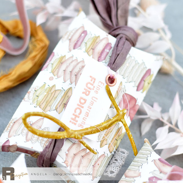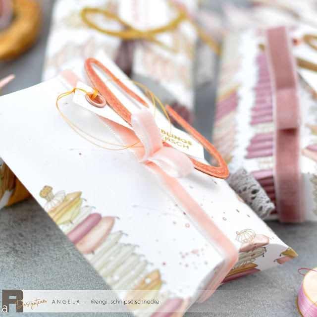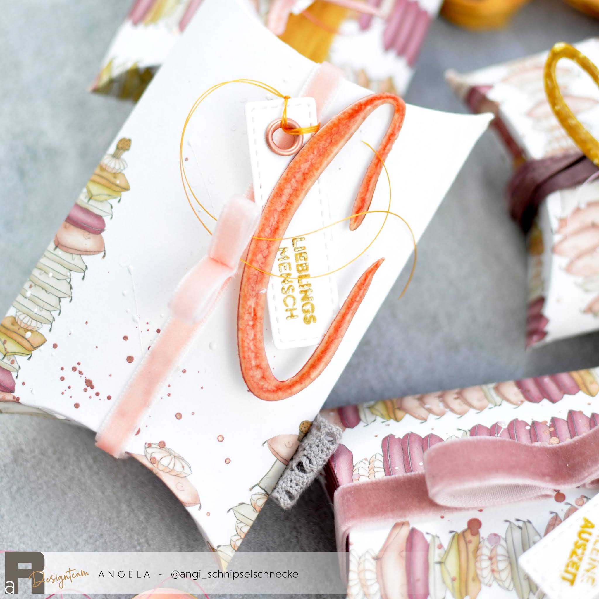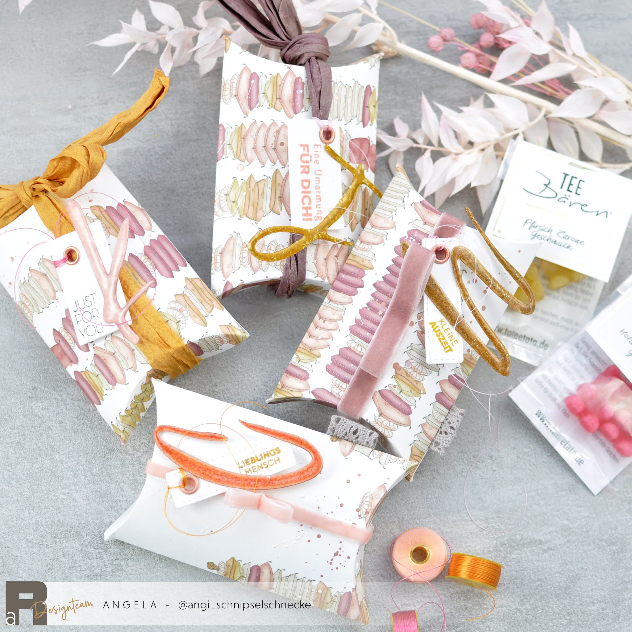 Ein Bogen tolles Designpapier, 4 kleine Pillowboxen gefĂŒllt mit leckeren BĂ€rchen, die sich bald auf den Weg machen. Die Initialen habe ich mit Wow Embossing Pulver verziert, zweimal in Farbe und einmal in Klar. Die machen sich gut – soo schön fett! Trotz der Fummelei und „Arbeit“ beim embossen, mach ich das immer wieder gerne! đ
